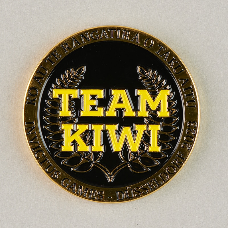 Challenge coins are made with a group or organisation symbol on them, and they represent membership or belonging. This challenge coin was made for the 2023 New Zealand Invictus Games Team.