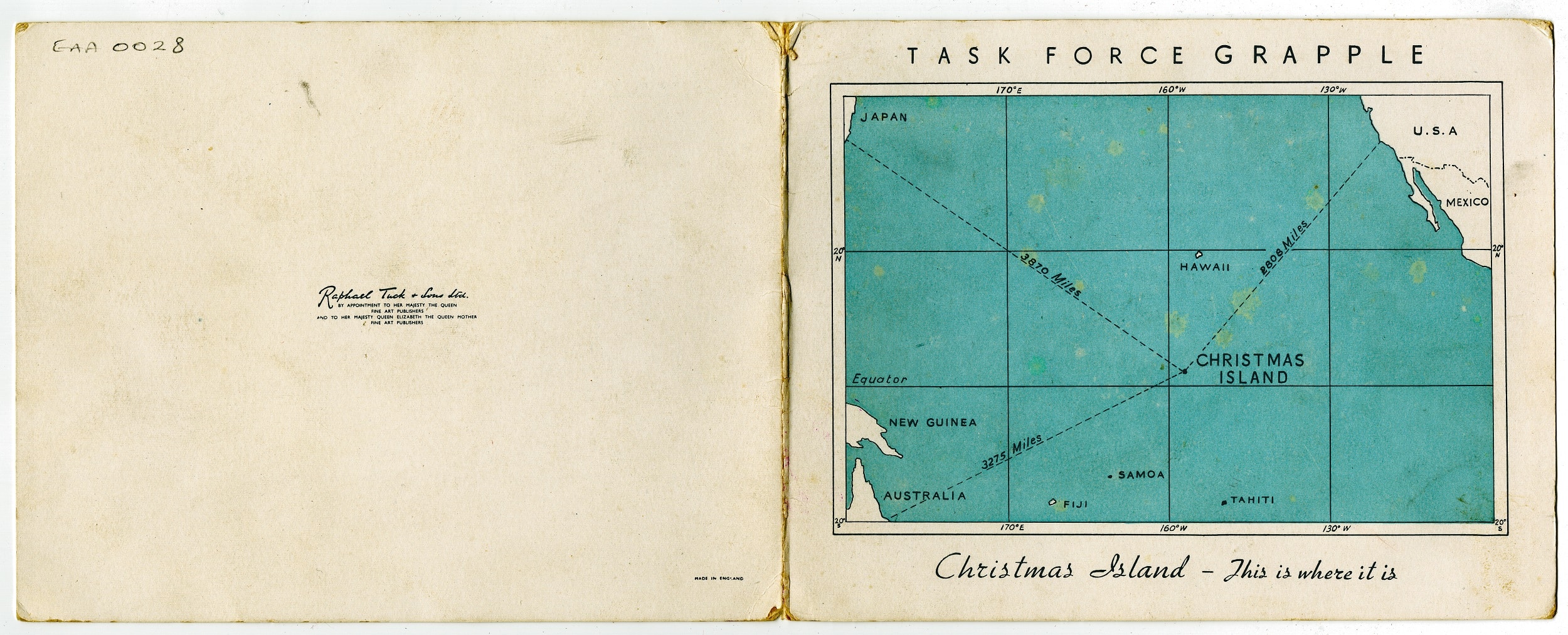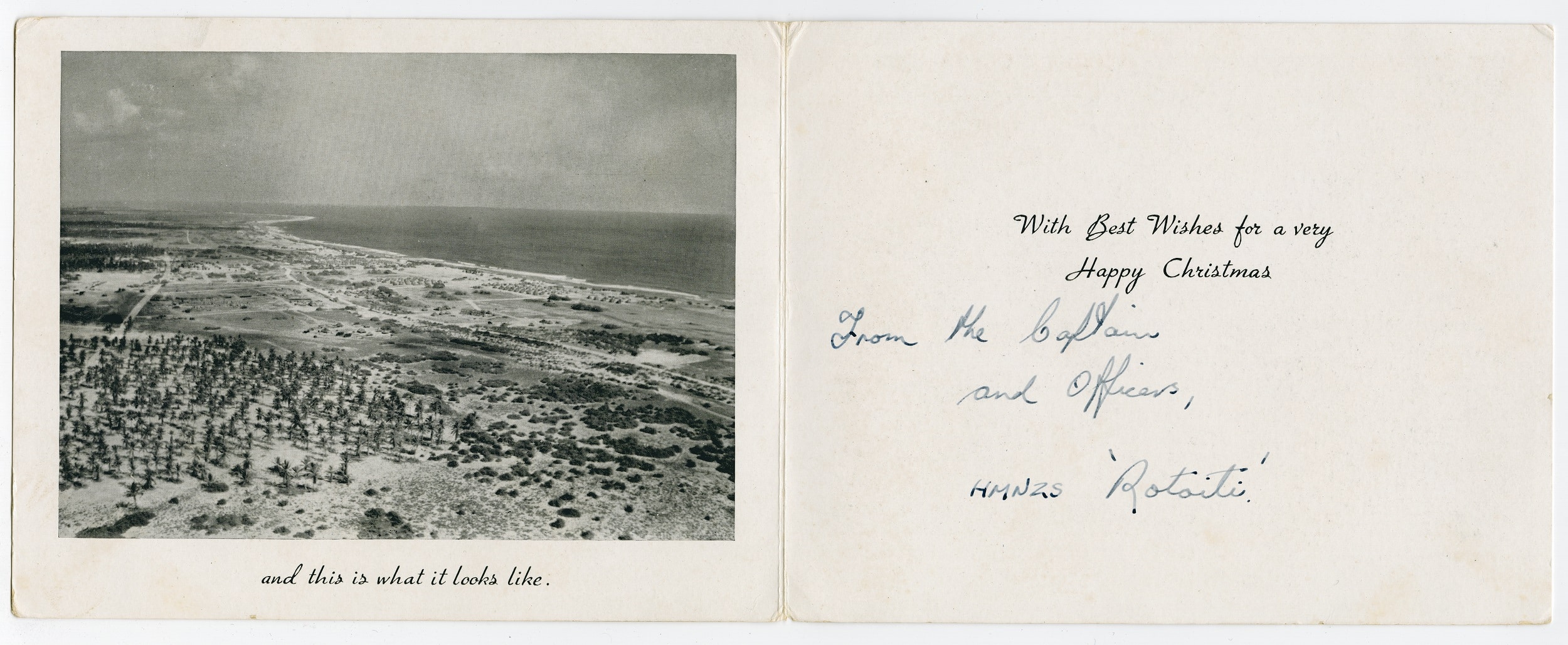 This 1957 Christmas card features a map of the Pacific Ocean with Christmas Island highlighted. It's inscribed with the words: This is where it is. Inside, a photograph of the island is accompanied by the text: And this is what it looks like. From the captain and officers HMNZS Rotoiti."