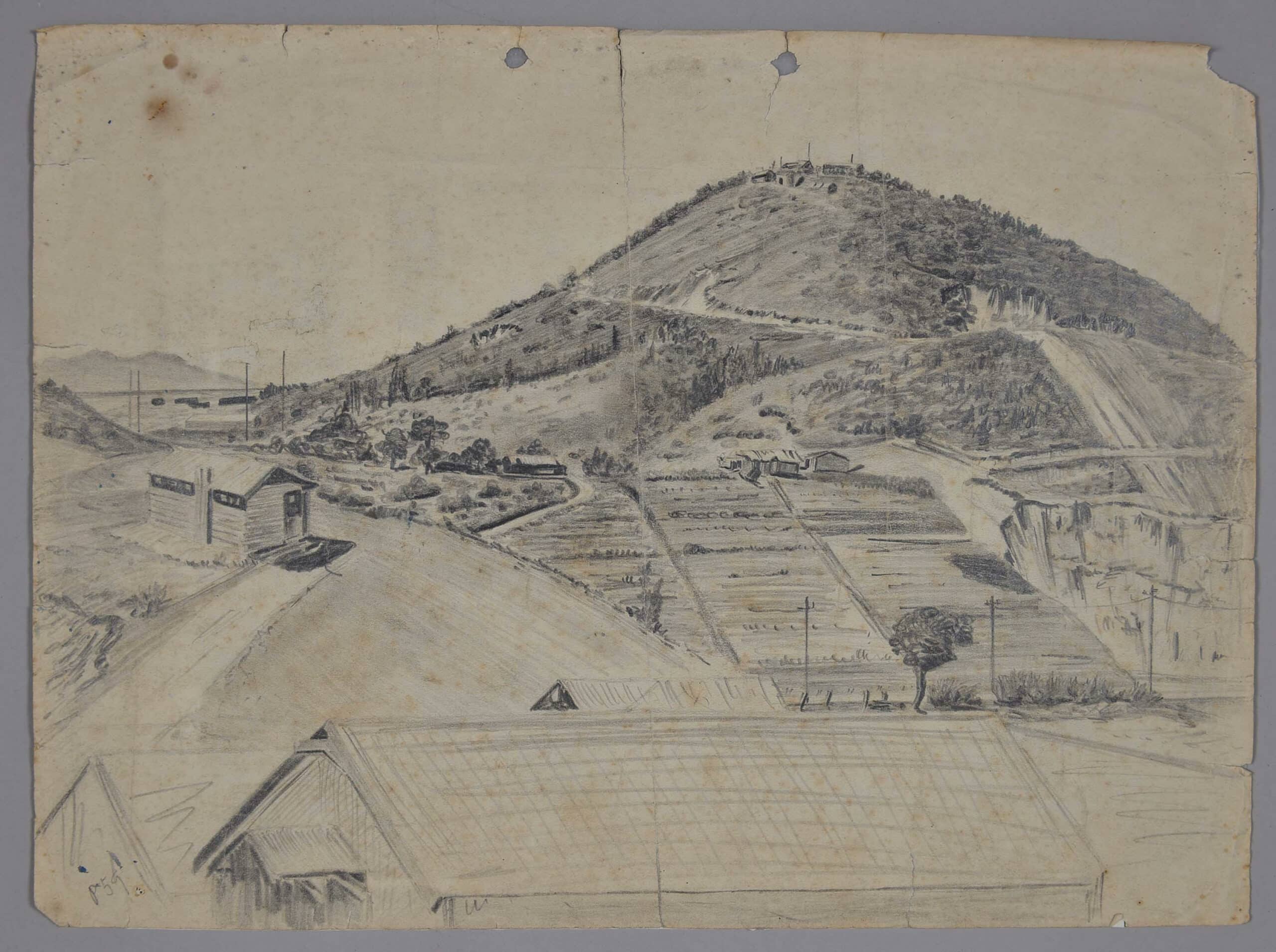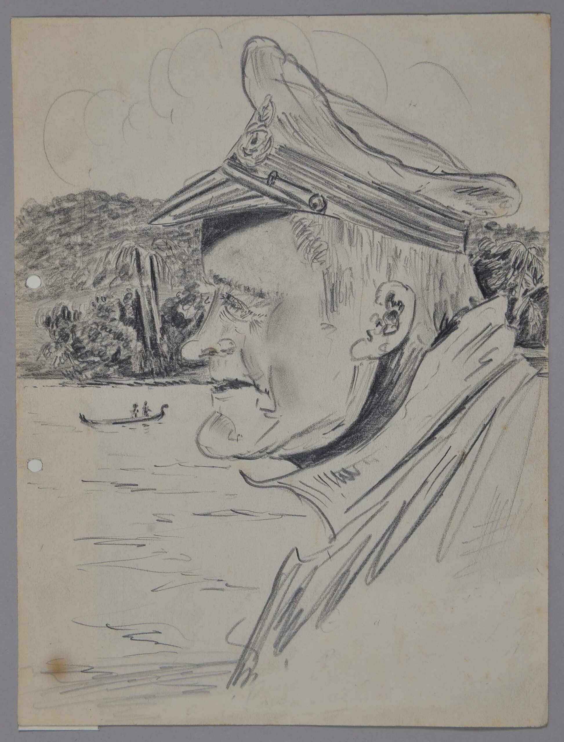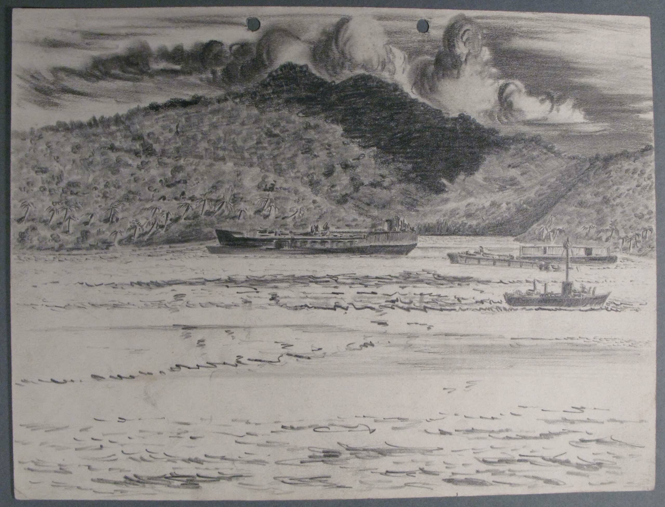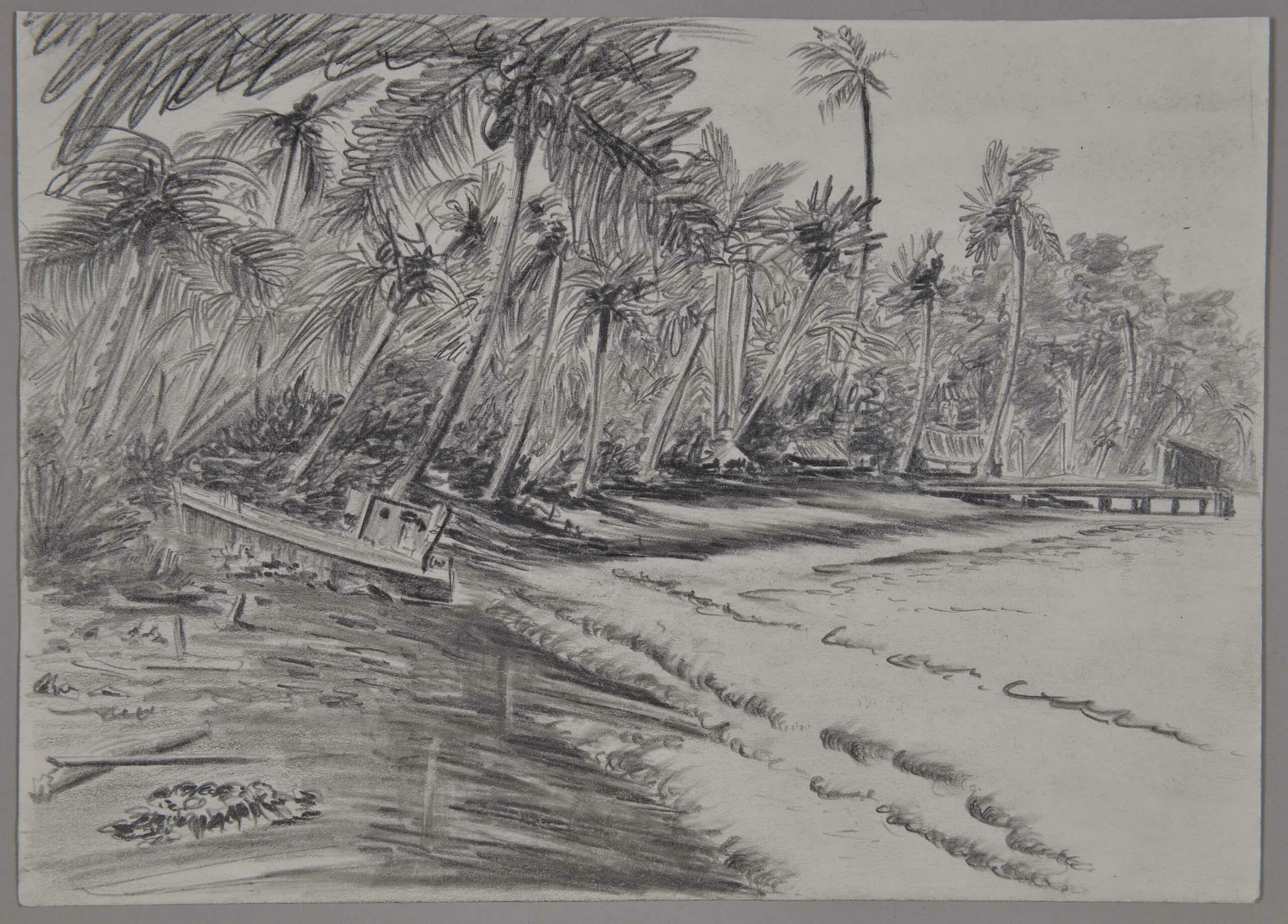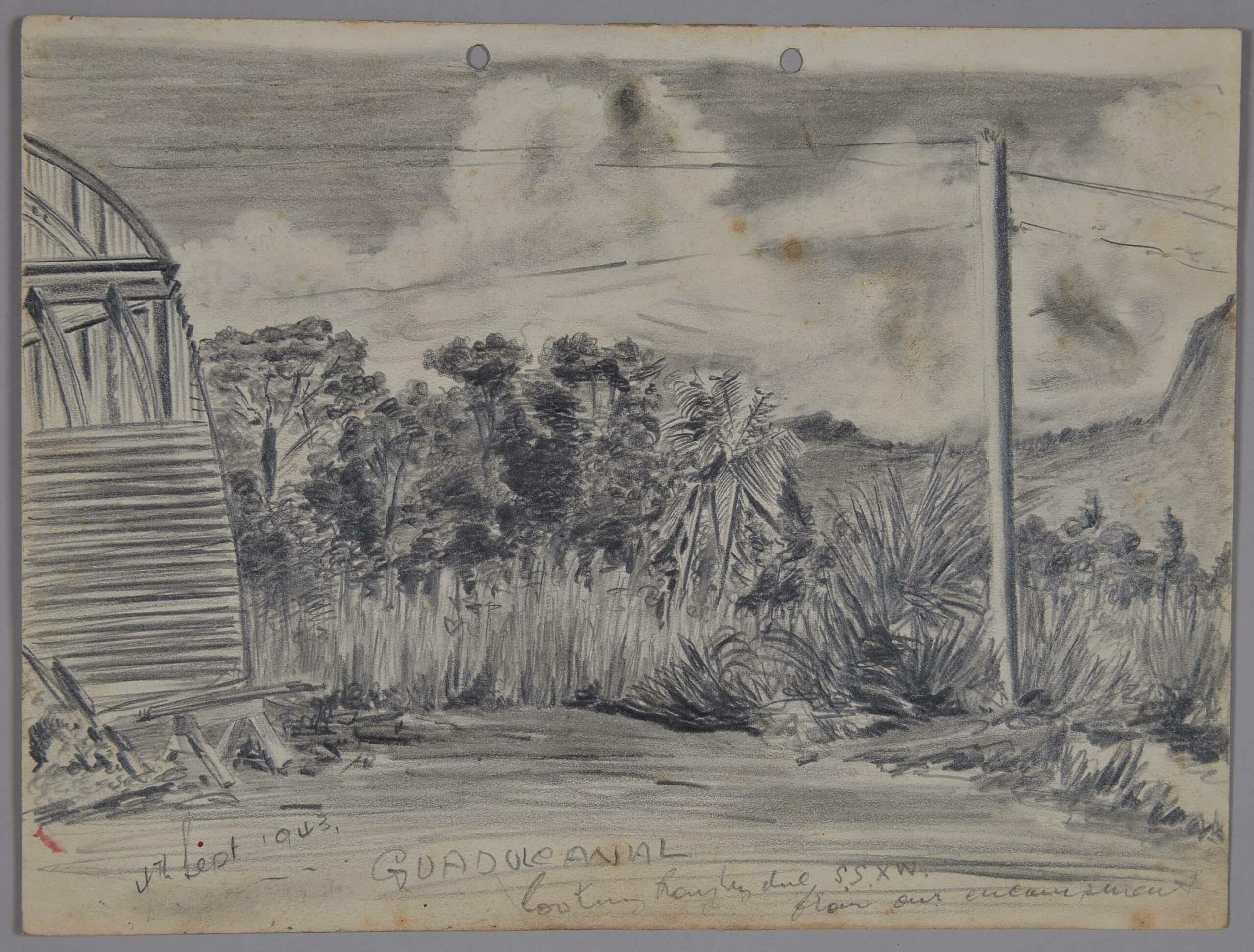 Owen (Miles) Spence falls into the category of “unofficial” artist, documenting his experience on his own accord. He was born in Christchurch in 1922 and enlisted as a radar operator in the Navy in 1941 at the age of 18. He trained at HMS Tamaki and Philomel, following which he was posted to HMNZS Cook in Wellington. In June 1943, he was promoted to Able Seaman Radar Operator, and around this time was posted to a radar station on Cuvier Island. From August of the same year, Spence was posted to the administrative base HMNZS Cook II in the Solomon Islands.