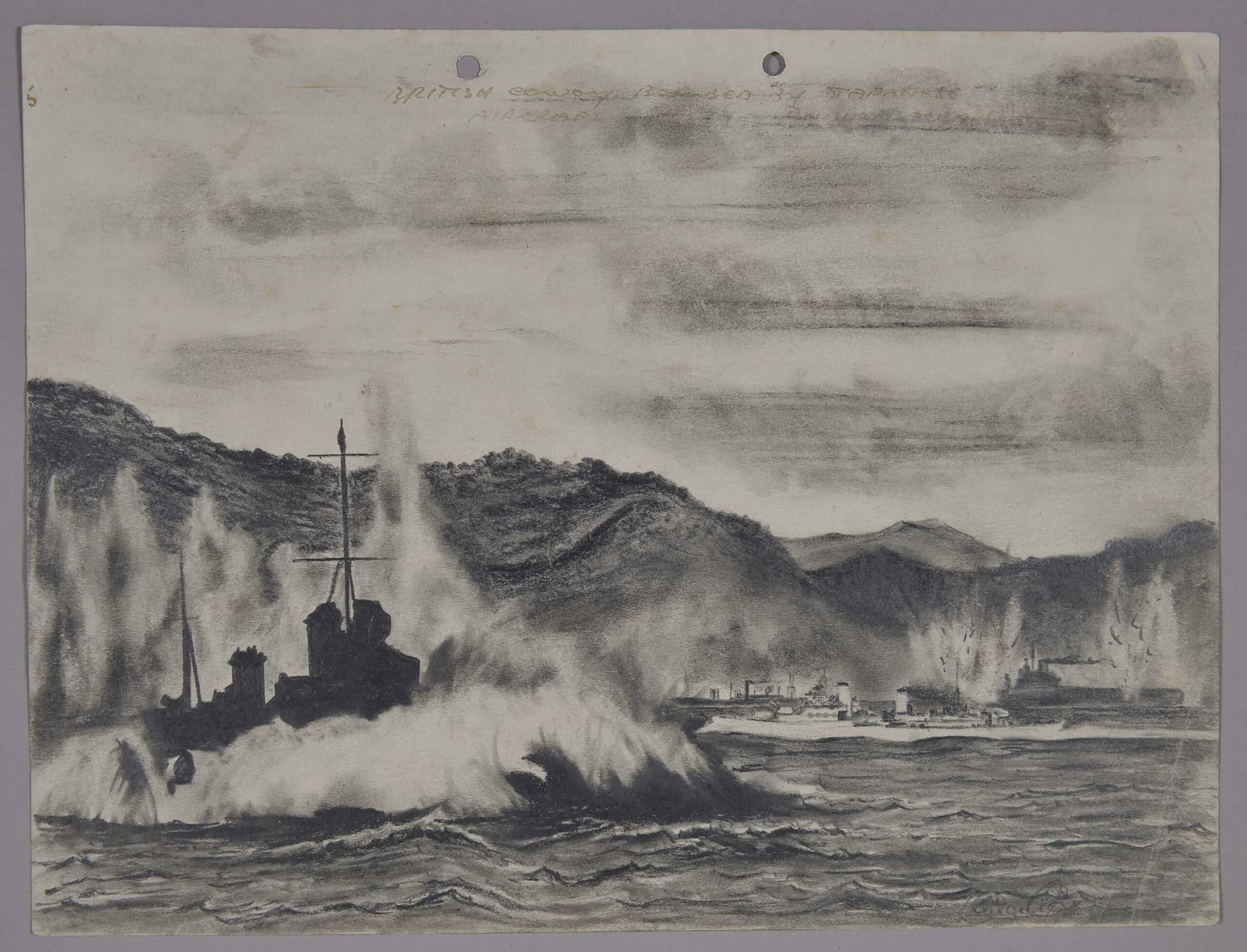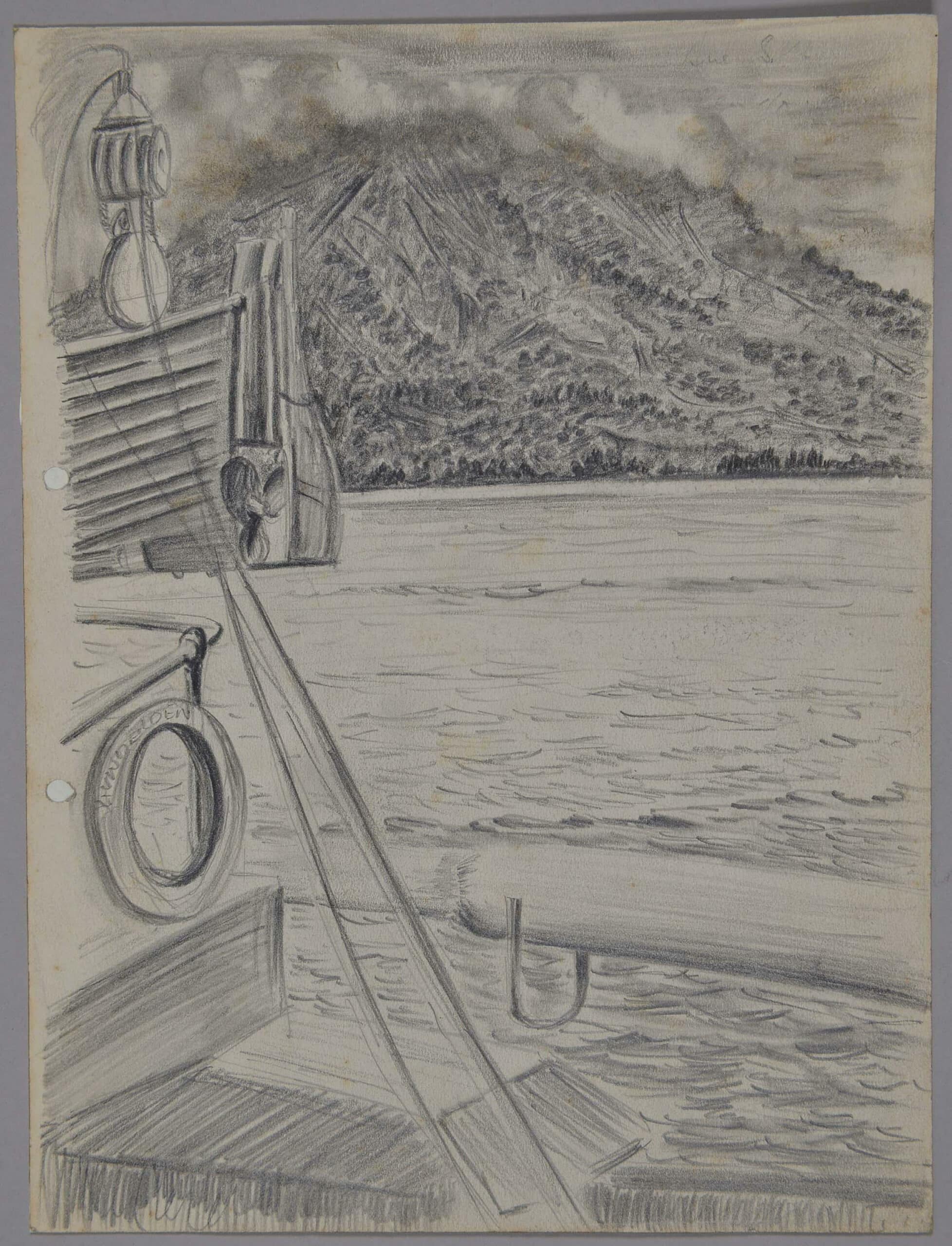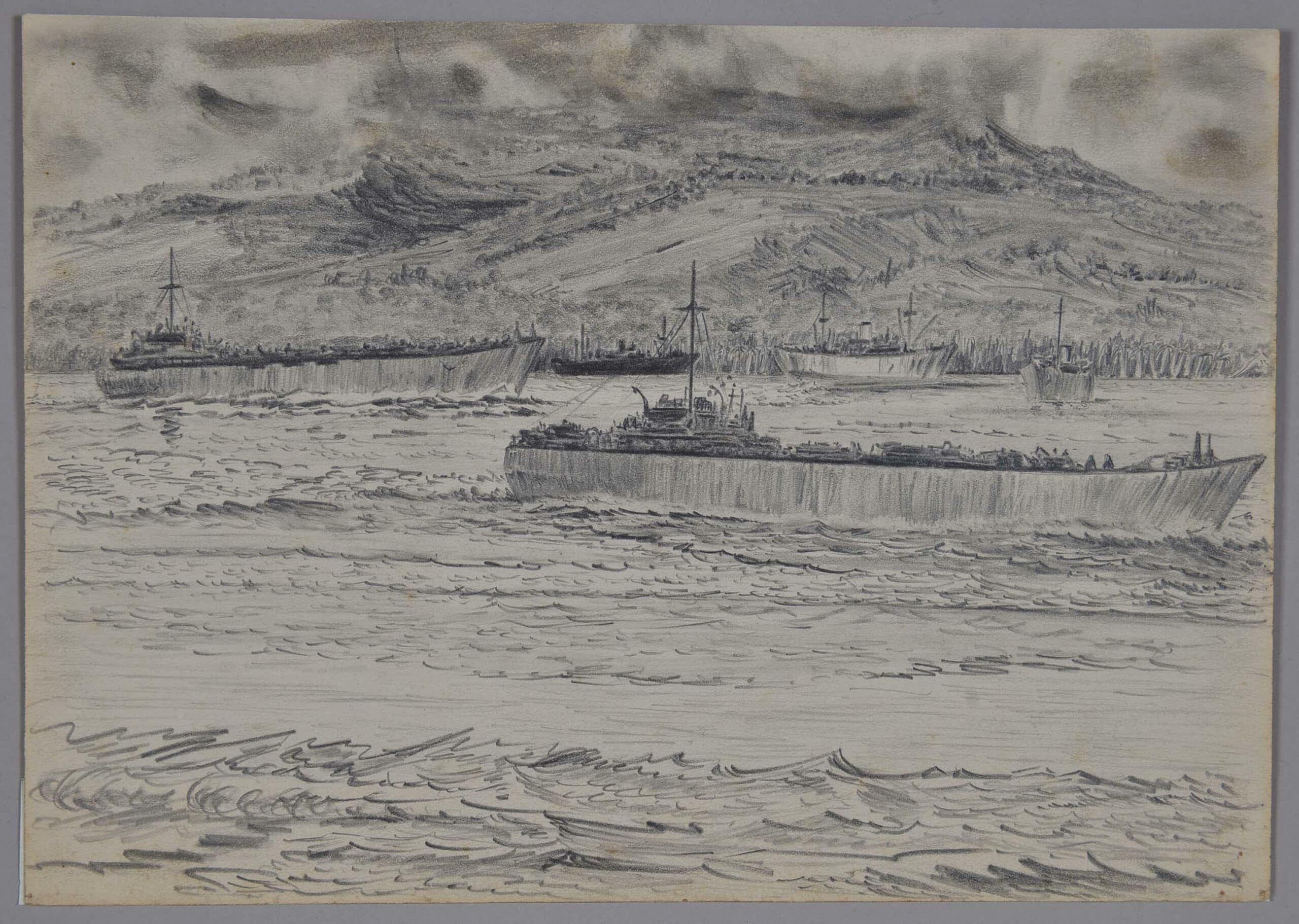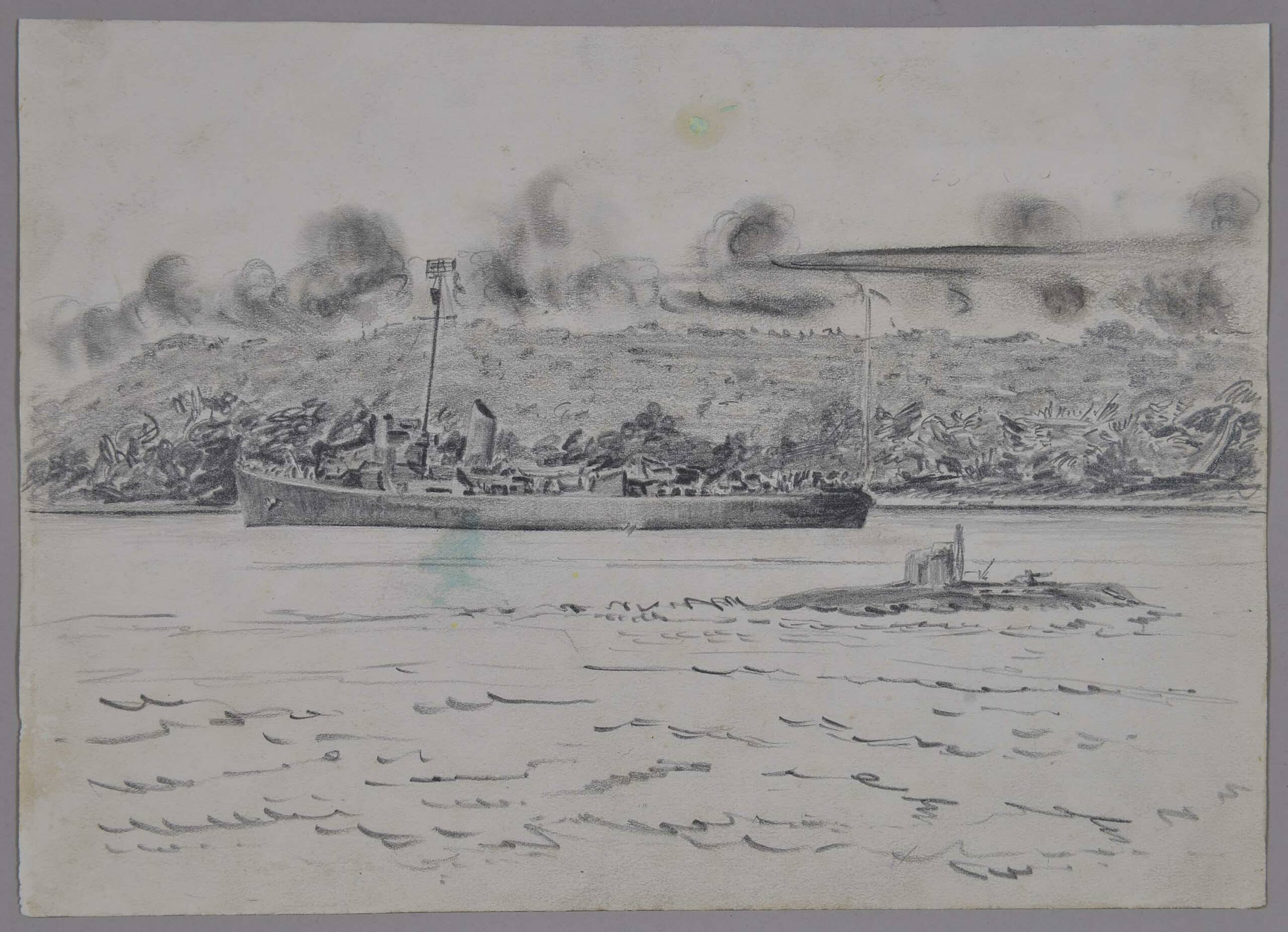 Following in the tradition of other active-duty war artists, Spence’s drawings depict scenes of camp-life ashore in the islands, and onboard ship, as well as scenes of battle. The drawings shown here are from the collection of the National Museum of the Royal New Zealand Navy, and a selection of these are displayed in the museum galleries.