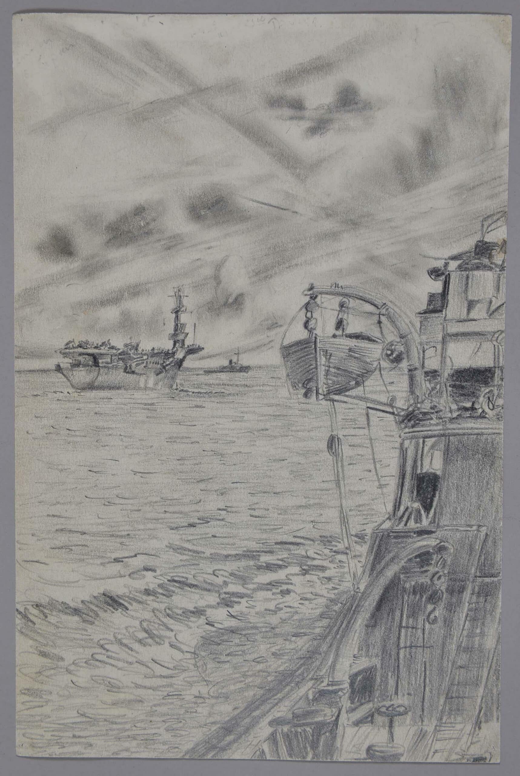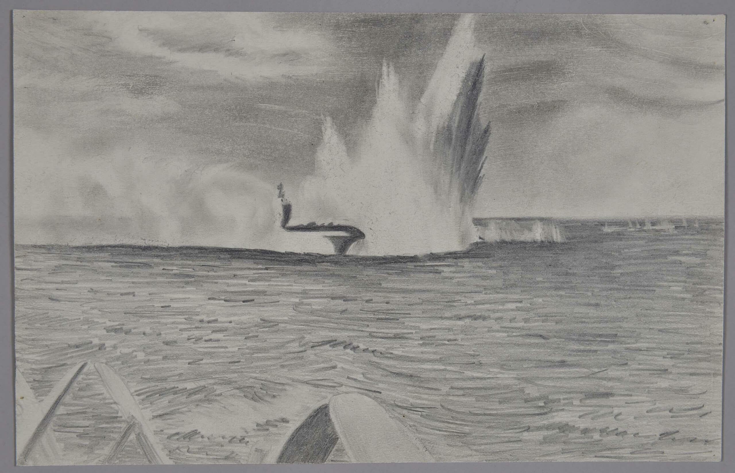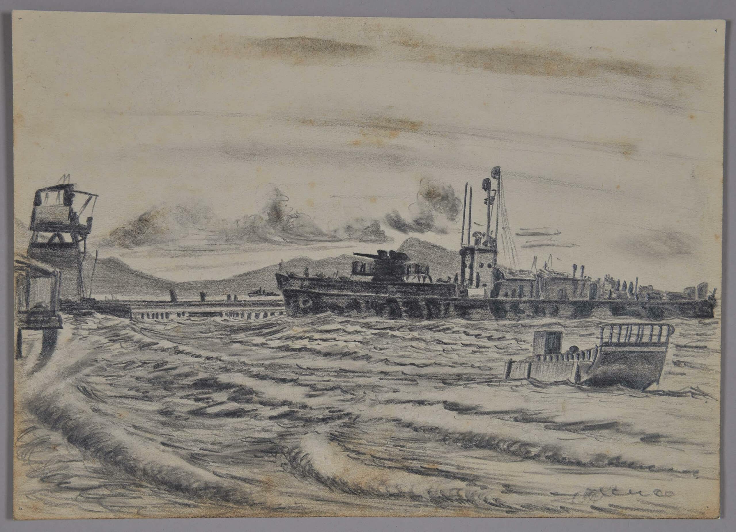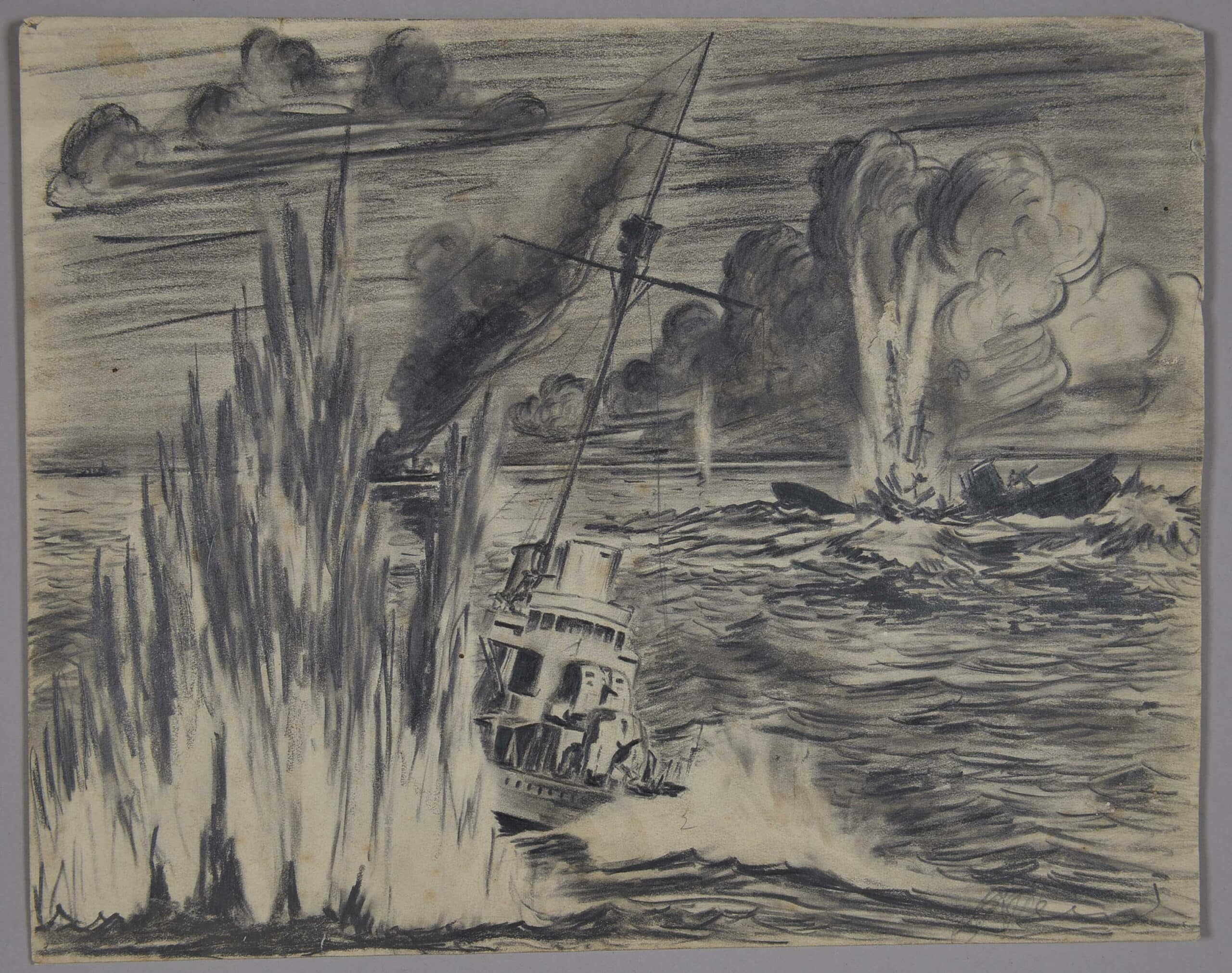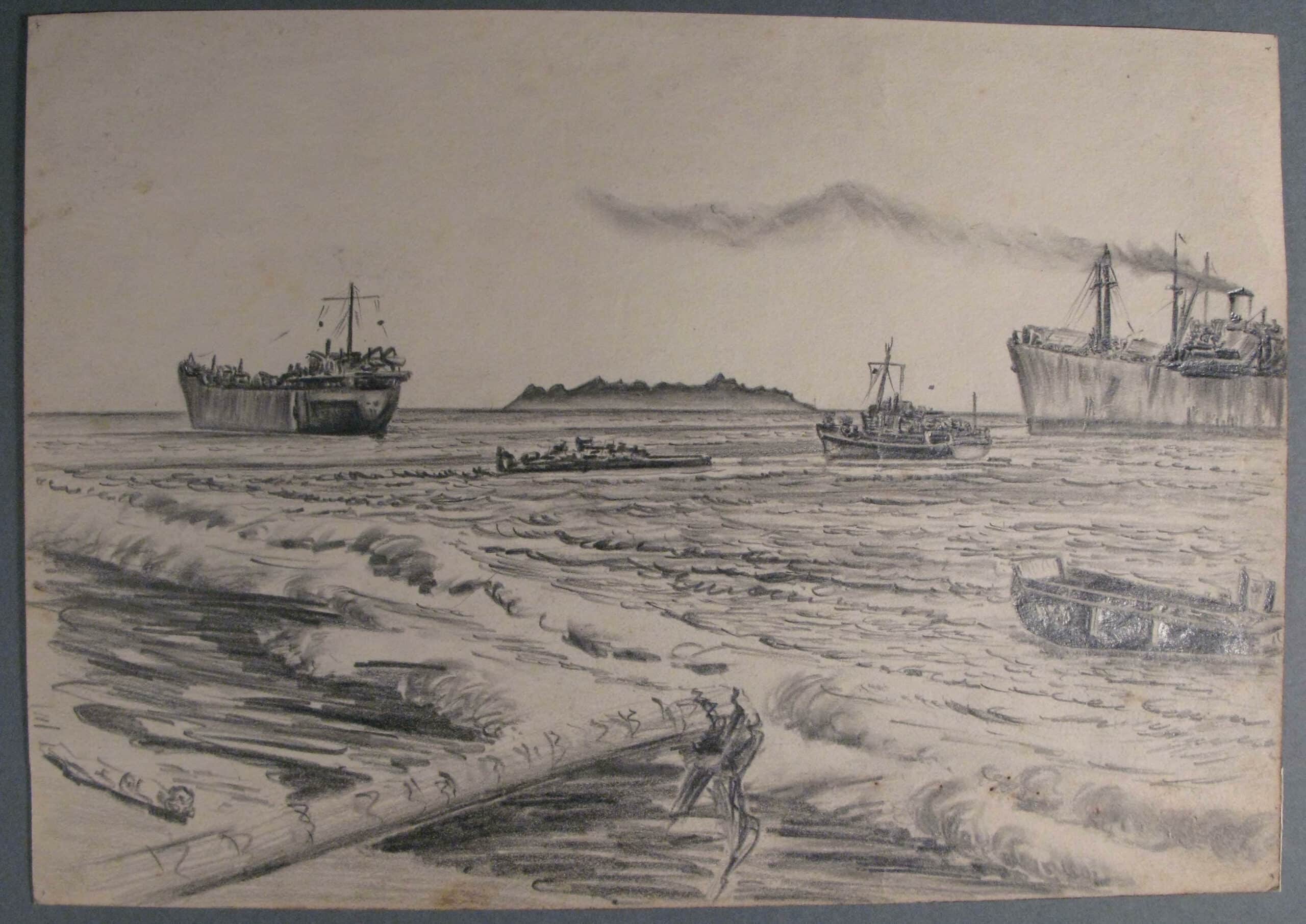 Following in the tradition of other active-duty war artists, Spence’s drawings depict scenes of camp-life ashore in the islands, and onboard ship, as well as scenes of battle. The drawings shown here are from the collection of the National Museum of the Royal New Zealand Navy, and a selection of these are displayed in the museum galleries.