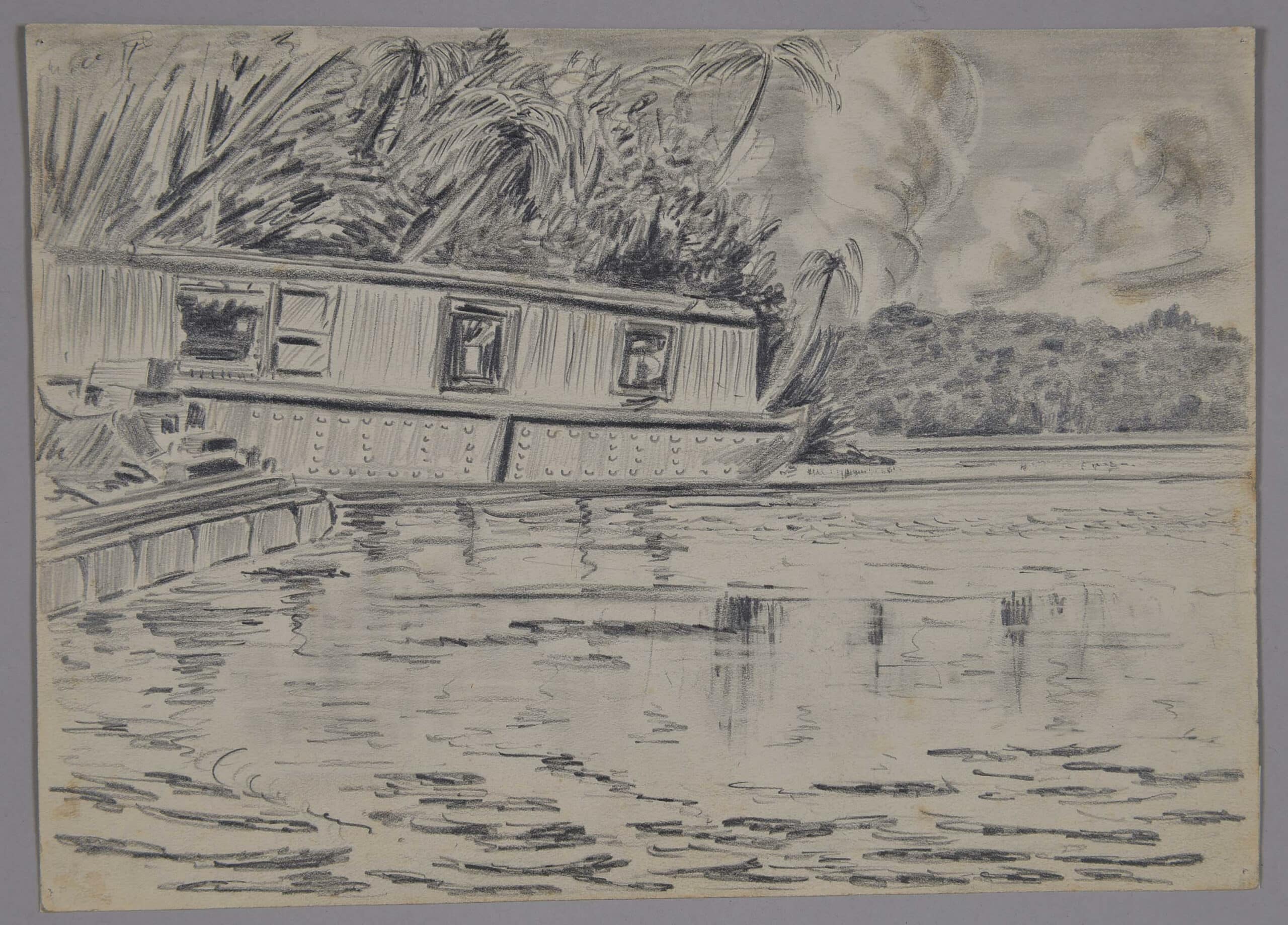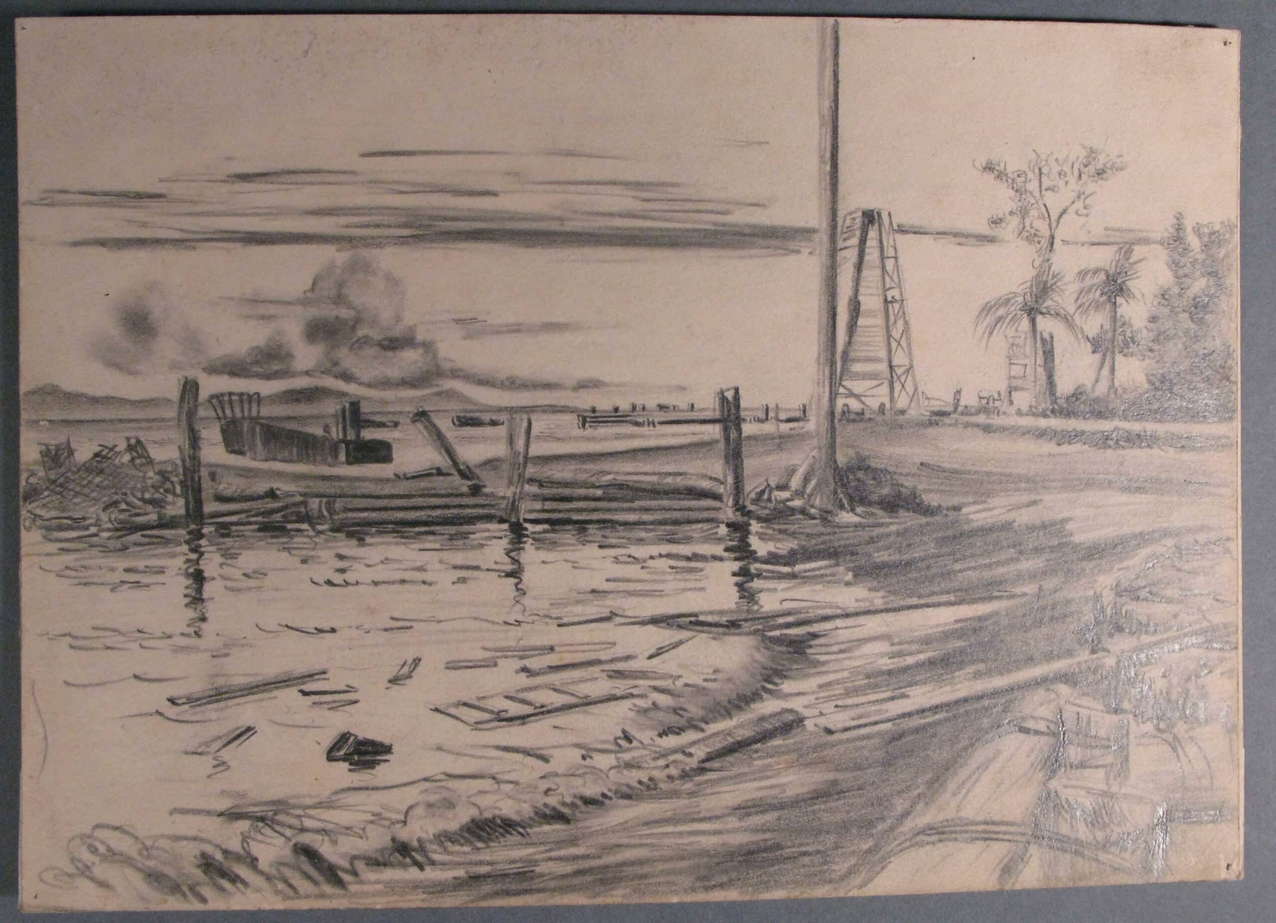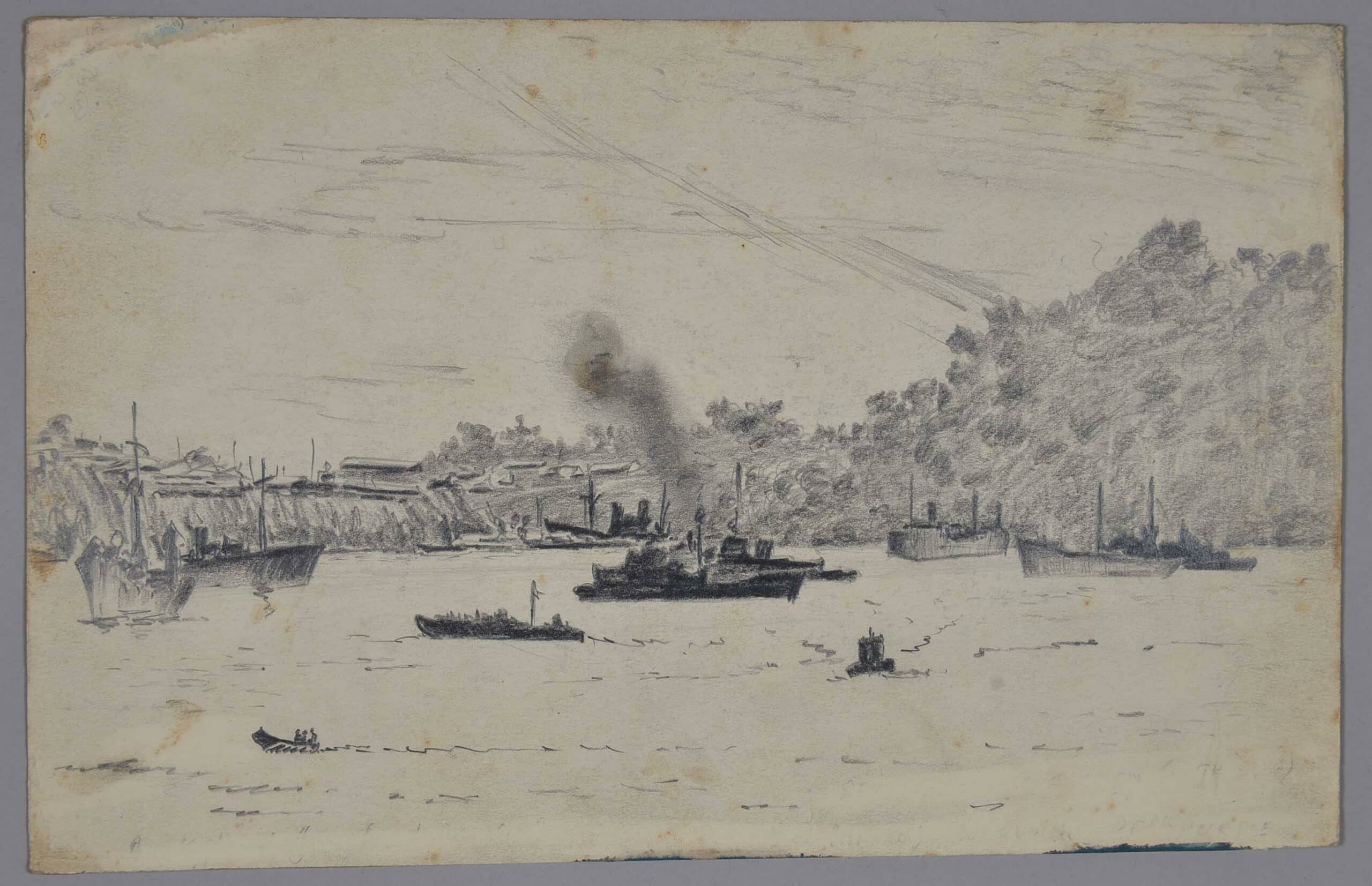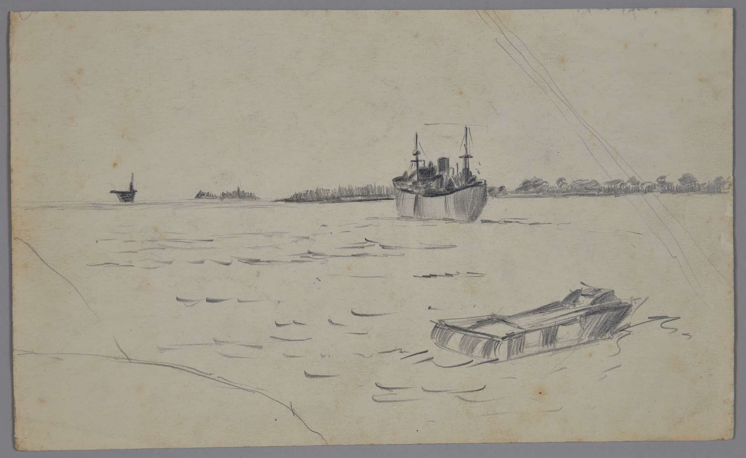 Following in the tradition of other active-duty war artists, Spence’s drawings depict scenes of camp-life ashore in the islands, and onboard ship, as well as scenes of battle. The drawings shown here are from the collection of the National Museum of the Royal New Zealand Navy, and a selection of these are displayed in the museum galleries.