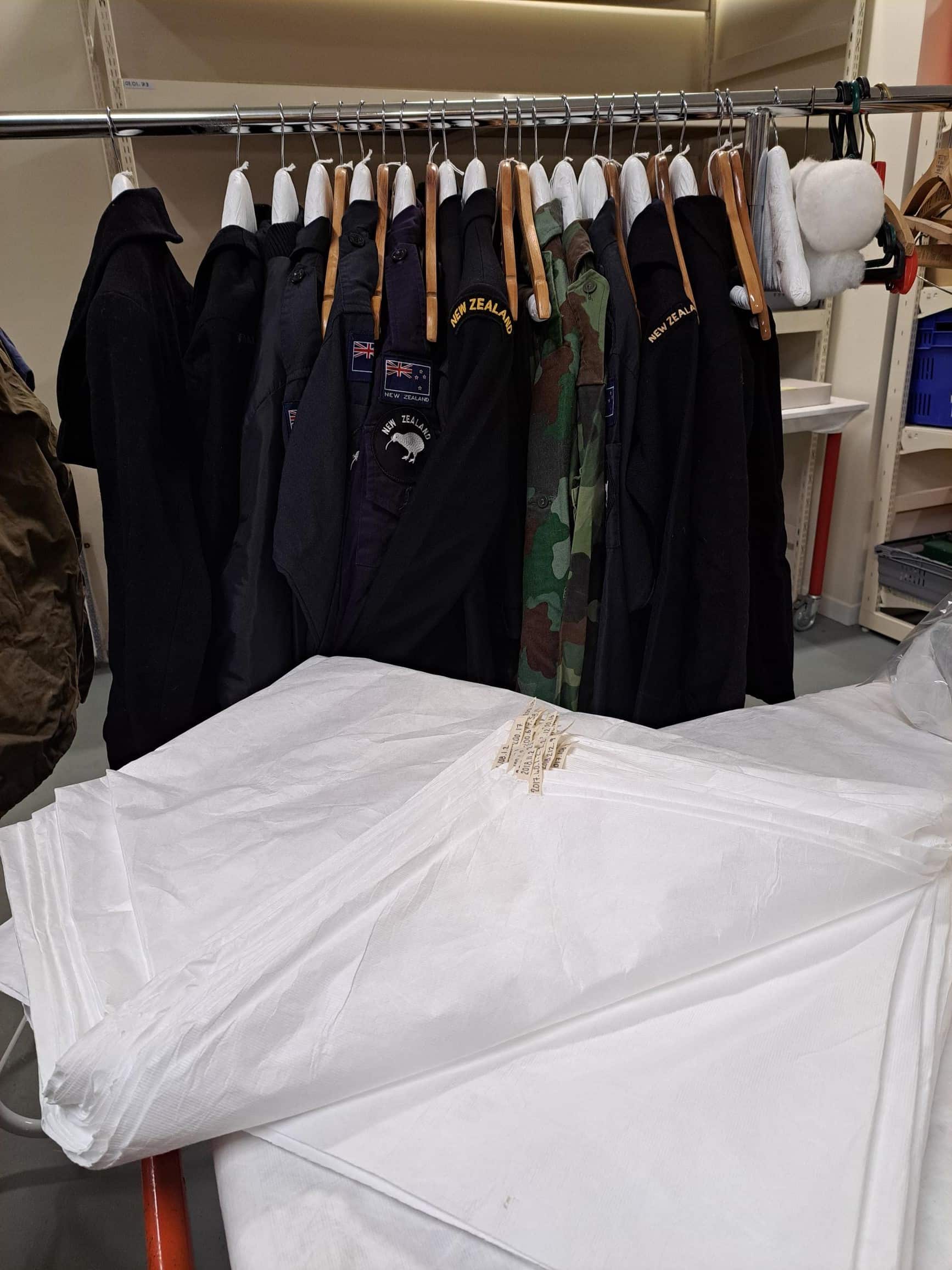 Decades of collecting has led to a tightly packed storage area full of pieces of clothing, inconsistently labelled and hiding under aging covers. It is all tucked away in the back of the Navy Museum Collections Store.