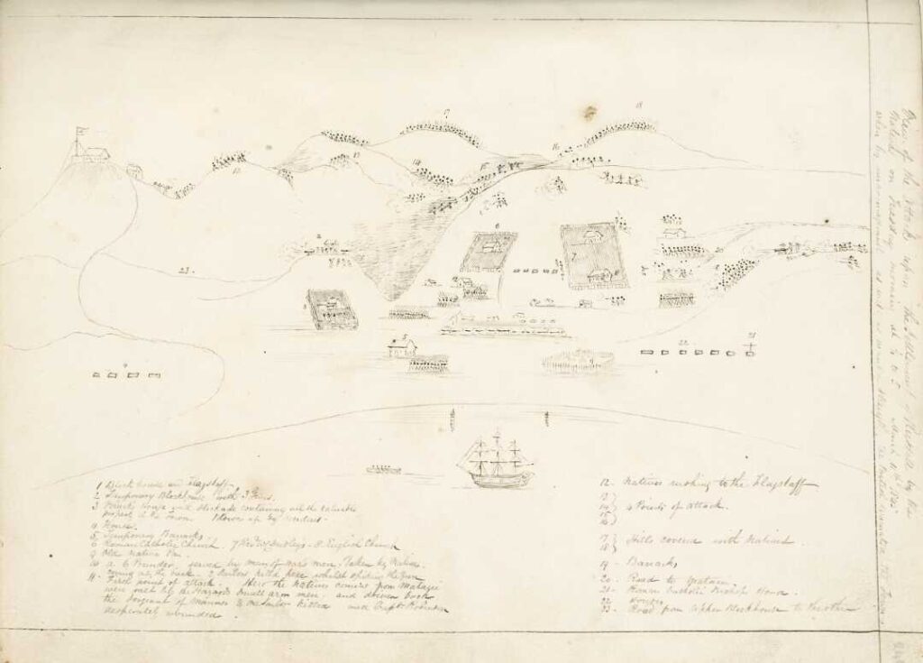 Later that day the townspeople were evacuated to the ships in the bay – including HMS Hazard, another sloop-of-war Victoria, and later to a British whaling ship Matilda.[5] Shortly after the evacuees left the main stockade at ‘Mr Polack’s house’, which had housed the majority of the town’s residents, a store of gunpowder unexpectedly exploded completely destroying the building, luckily without any casualties.[6]