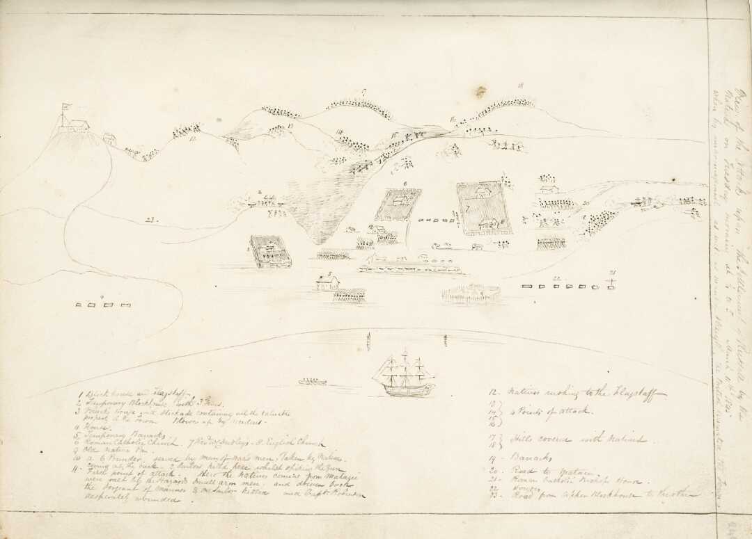 Spurred on by the recent destruction of one of their defensive positions the sailors and militia troops also headed for the ships.[7] Once all Pākehā were out of the town, George Phillpotts, commander of the militia – and in temporary command of the naval force after Hazard’s Captain David Robinson was wounded in the fray – ordered Hazard to bombard the town.[8] One of the cannonballs fired on this date is on display in the ABC Room at the Navy Museum.[9]