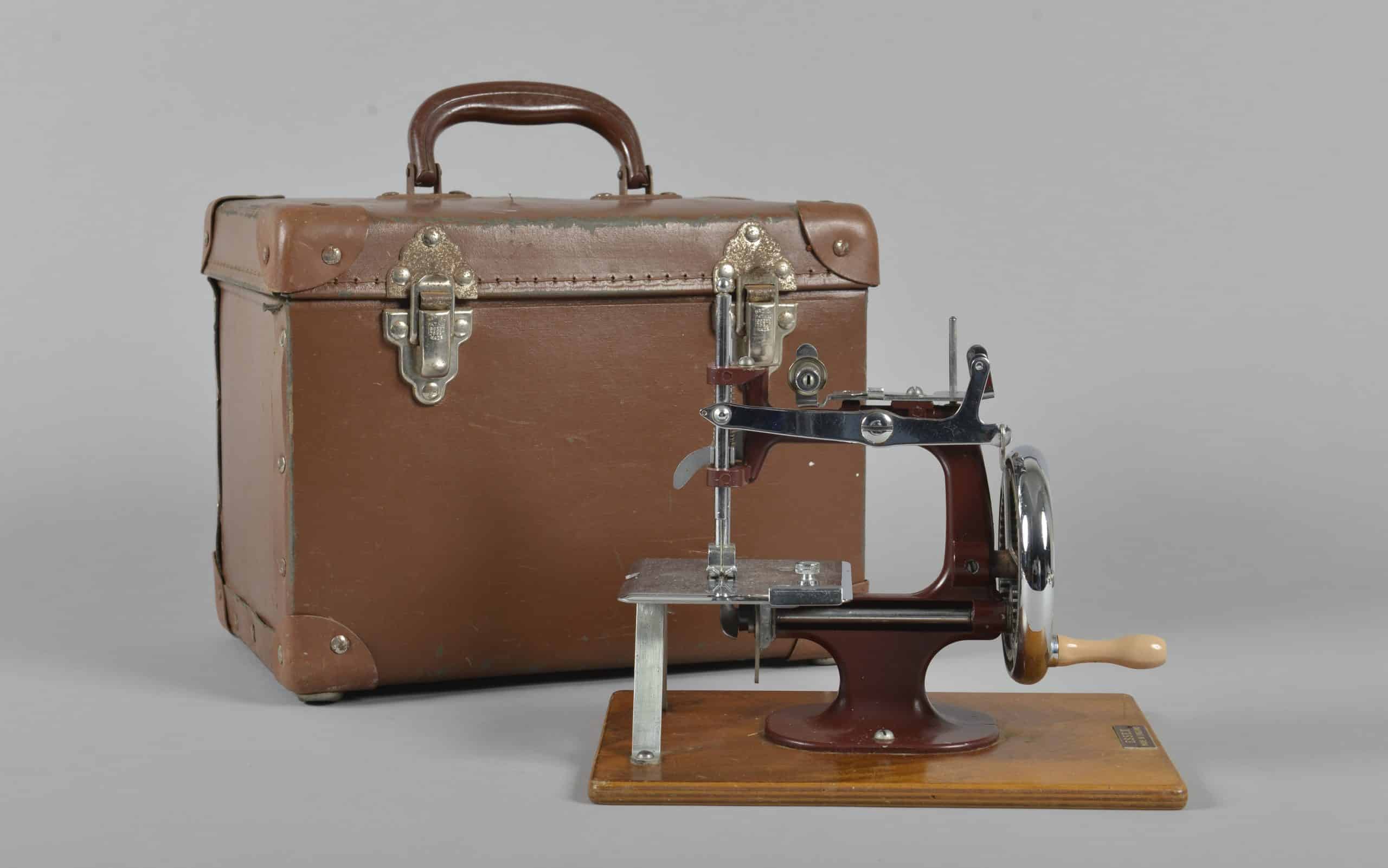 The first is the Essex Miniature Sewing Machine, MK1. In response to a shortage in sewing machines after World War Two, the Essex Engineering Works began production on this series in 1946; around 150,000 were sold between 1946 and 1956. Our machine is believed to have been used on HMS Achilles between 1946 and 1948.