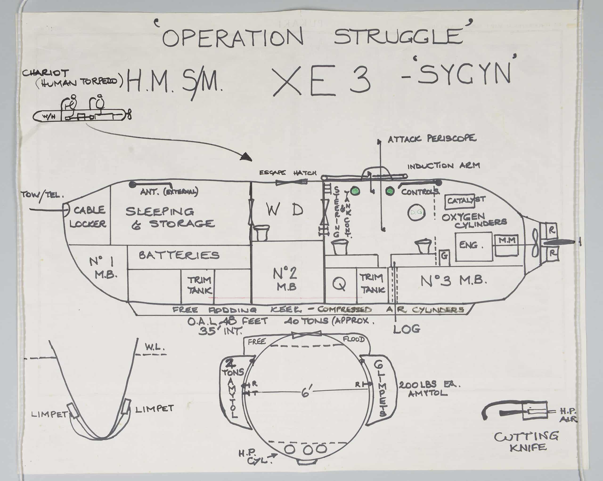 XE-craft were towed to their area of operation by a full-size submarine – in this case, HMS Stygian – with a passage crew onboard.