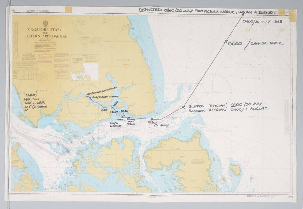 Then at 0430 they dived as a large tanker and escorting fishing boat came into view, heading in their direction. By 0800 they had made their way through the Johore Shoal in only 30ft of water and at 0930 they went through the open gate on the boom defence passing near a Japanese guard vessel.