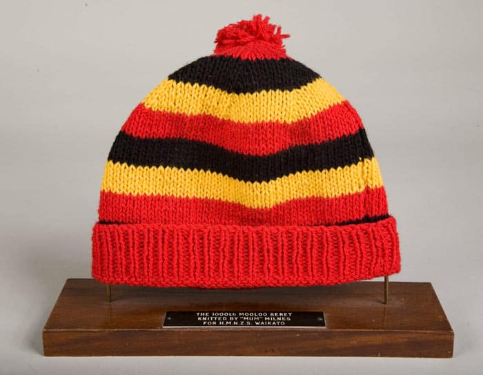 This is the 1000th beret knitted in the 1960s by ‘Mum’ Milnes for the crew of the frigate HMNZS Waikato.