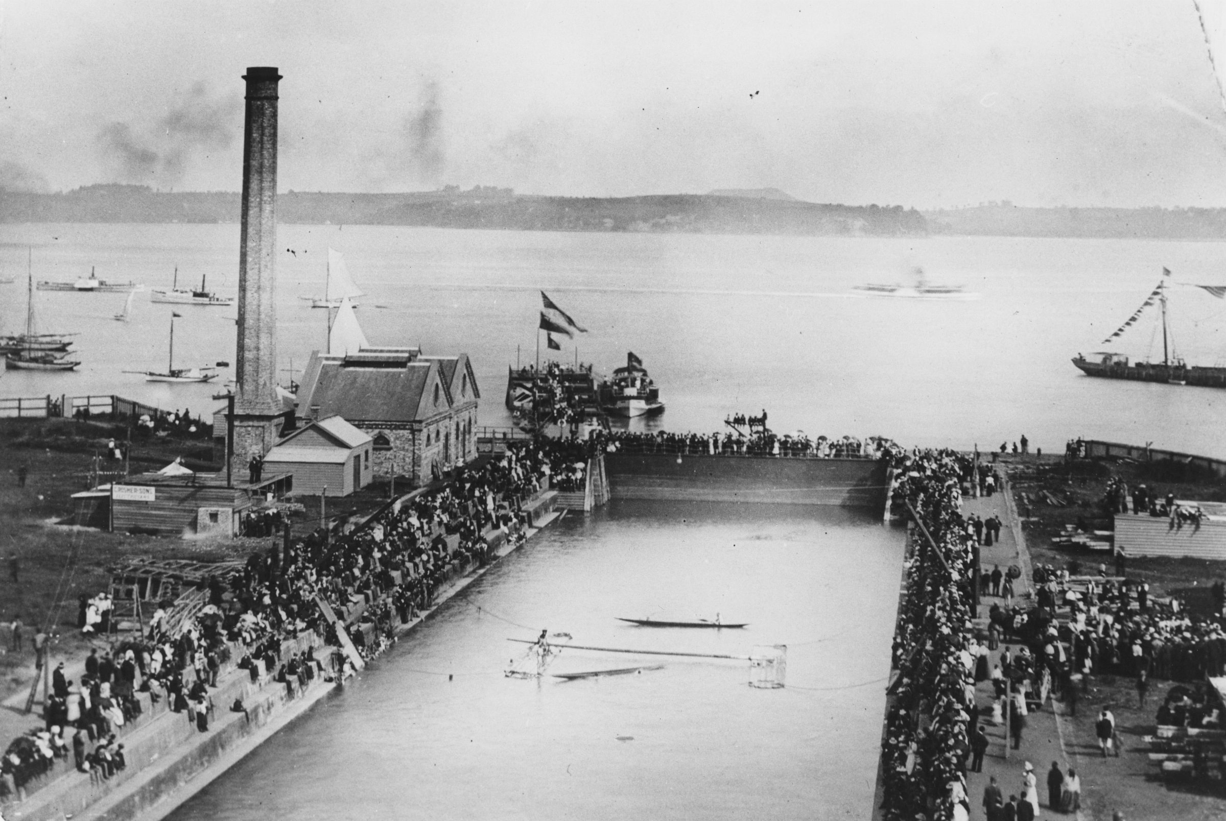 On 16 February 1888, the official opening was held. As arranged HMS Calliope and Diamond docked down, Calliope breaking a ribbon stretched across the dock. Unfortunately, the six casks of beer provided for refreshment of ships’ crews and dock guard led to a brawl ending proceedings.