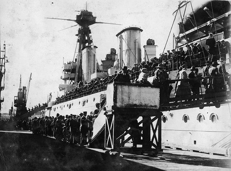 In 1909, Prime Minister Sir Joseph Ward pledged New Zealand’s loyalty to the Crown by offering to purchase a battle cruiser for the Royal Navy. This ship, which was given the name HMS New Zealand, was loaded with the same armament as the Dreadnought class battleships, but was quicker and more nimble. The old HMS New Zealand was renamed HMS Zealandia and handed over with her name, the ship’s bell. The new New Zealand was to become known as a lucky ship, surviving the three major naval battles in the North Sea during the First World War with only one hit and no loss of crew.