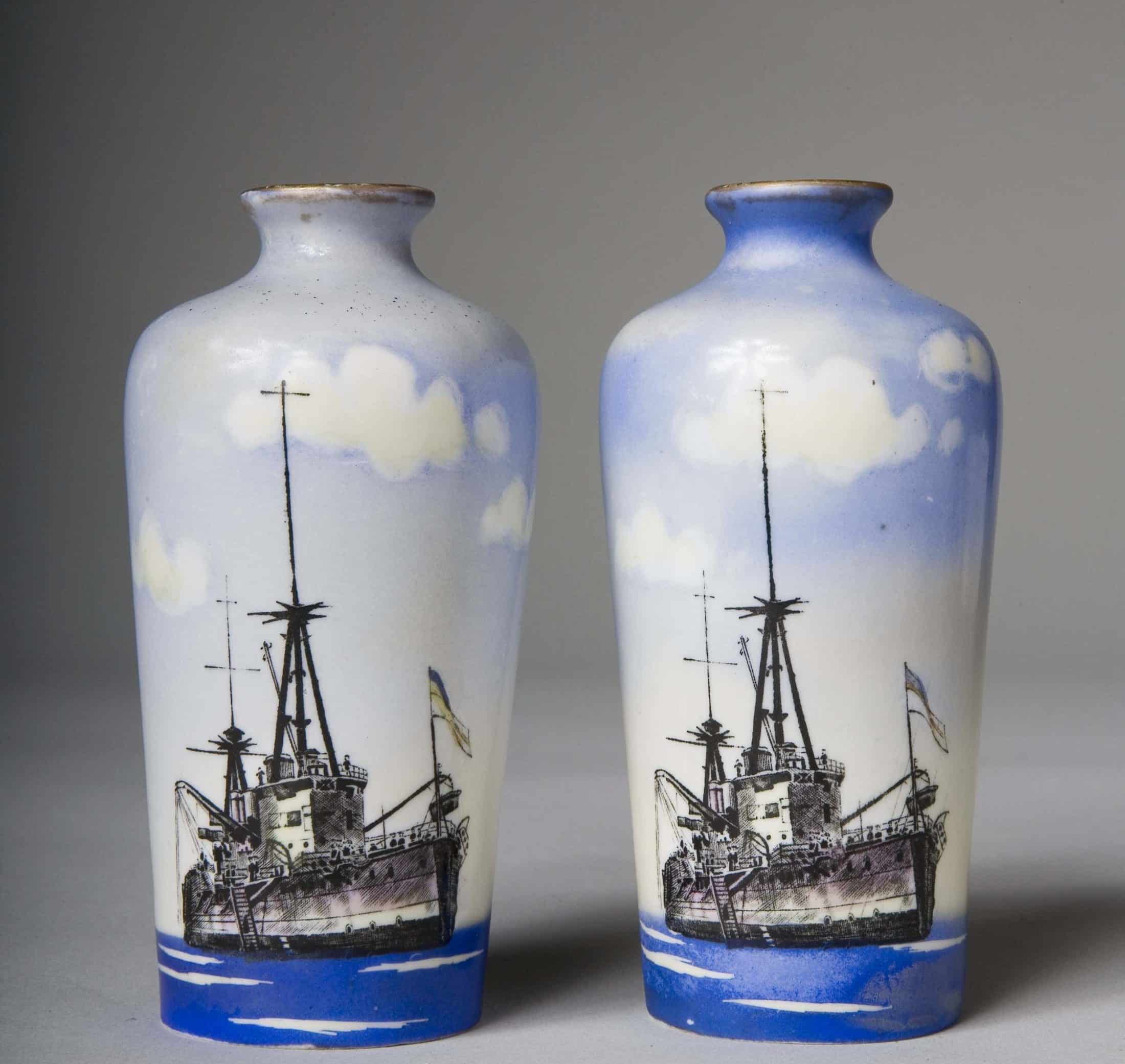 Ceramic vases with painted scene of HMS New Zealand.