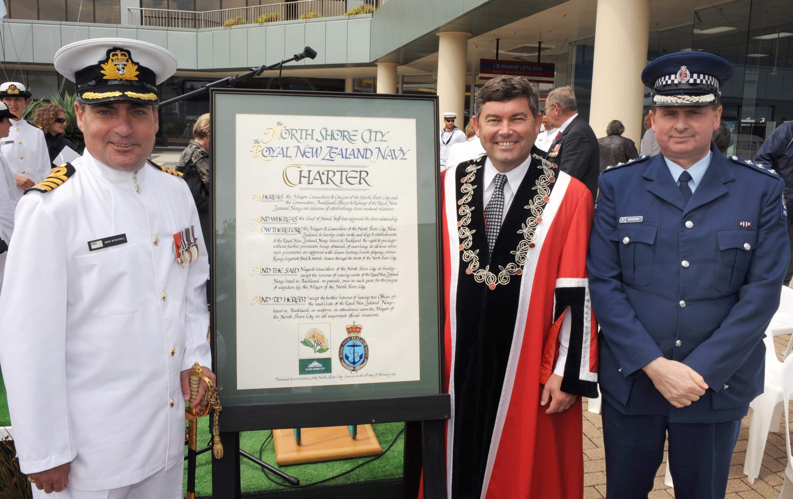 Up to the formation of the Auckland Super City the RNZN enjoyed the freedom of North Shore City based on the original charter issued for Takapuna and Devonport. This Charter is now in the object collection of the Navy Museum.