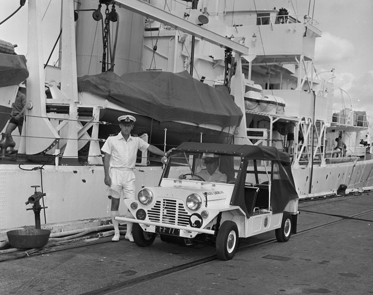 Mini Mokes were the shore transportation for ships when they were in port. The main job of the Moke, the first job when it arrived in a port was to collect and deliver the ship’s mail.