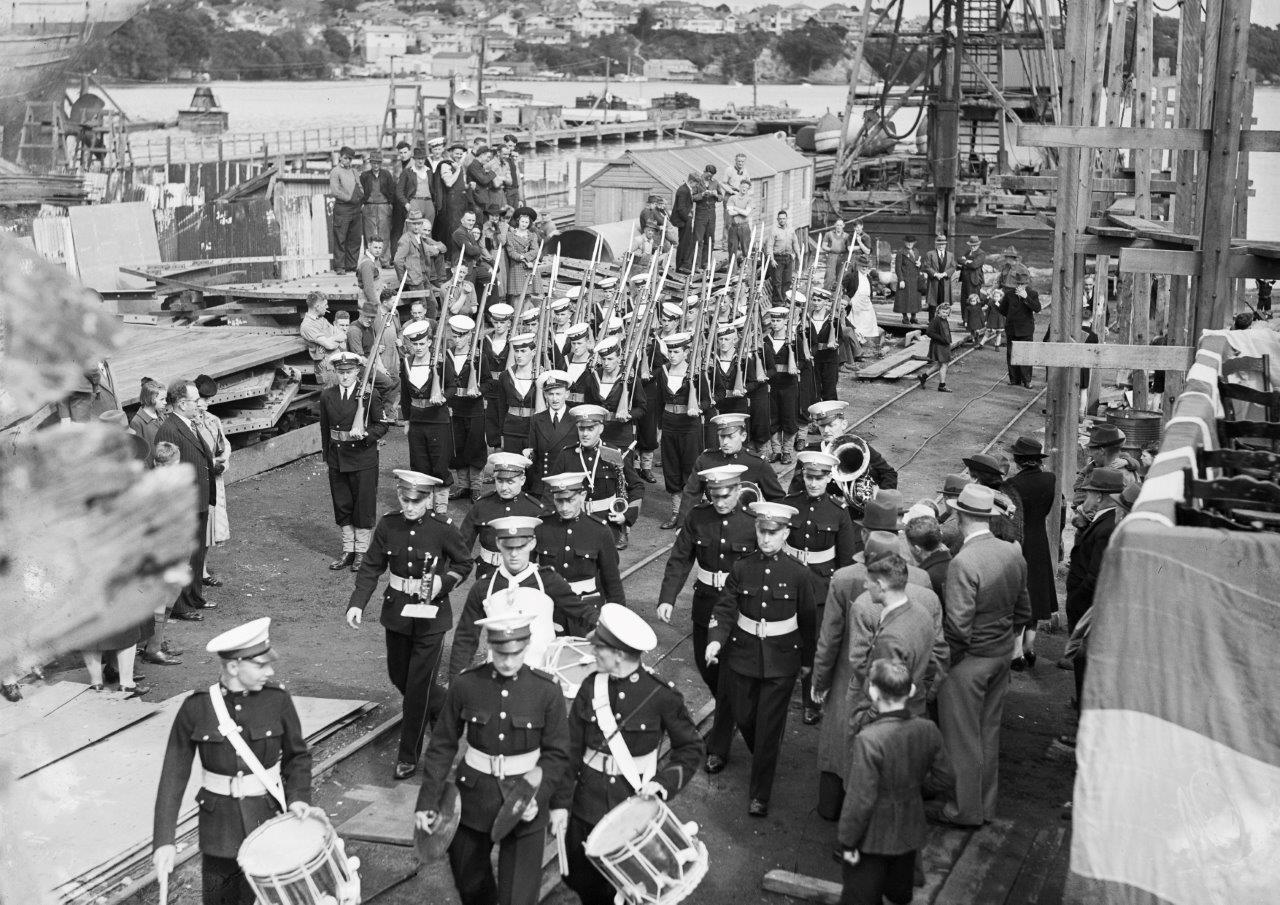 The Royal Marine band served with the RNZN for 36 years. A band first arrived for service with the New Zealand Division of the Royal Navy aboard the cruiser HMS Dunedin in 1924.