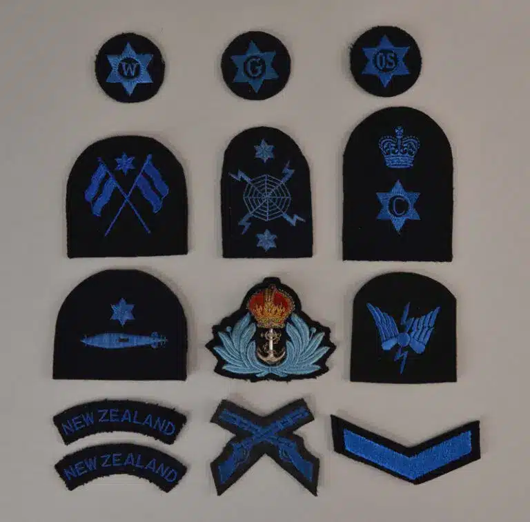 T2009.174.5 – Writer; 2005.081.1.8.1 – General Duties; QAW 0001 – Officer Steward; T2009.174.4 – Signaller; T2009.173.1 – Radar Plotter; T2009.174.3 – Petty Officer Cook; 2005.1683.1 – Torpedo Maintenance; CSO 0001 – Ofiicer’s Cap Badge; 2007.36.8 – Radio Operator; T2009.176.1 – Pair of New Zealand Shoulder Flashes; T2009.174.6 – Marksman; T2009.175.1 – Good Conduct Chevron.