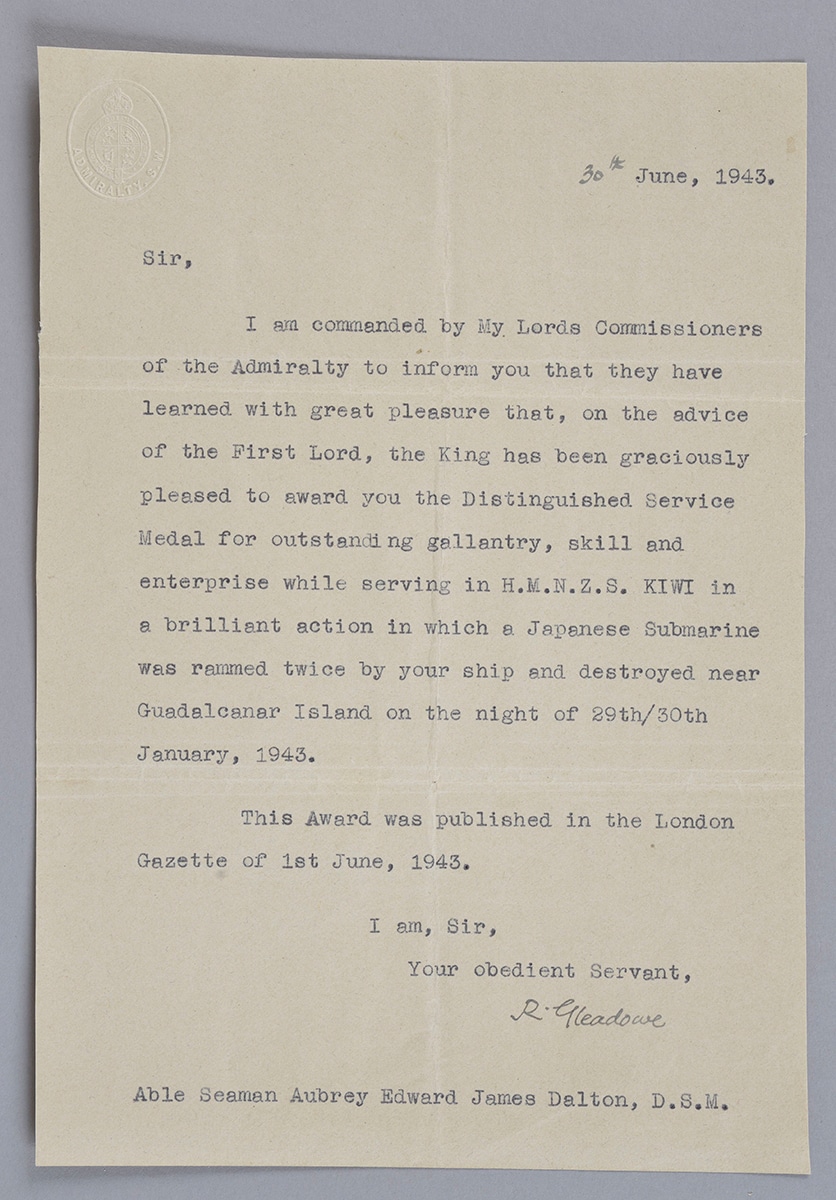 Aubrey Dalton was a “hostilities only” sailor, meaning he was only in the Navy during the Second World War and left when the war was finished.