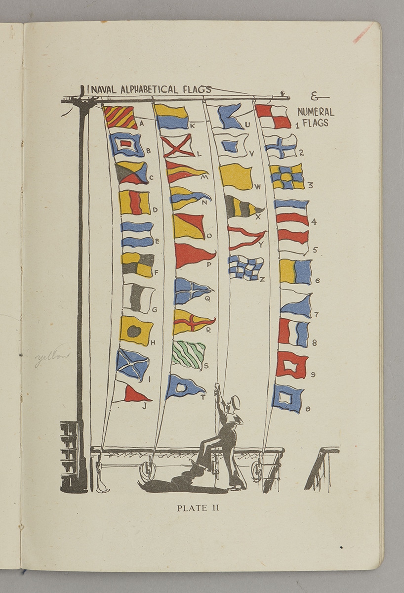 A page from the Seaman’s Pocket-Book 1943 shows communication flags used by the Navy. Some flags represent letters of the alphabet, some flags represent numbers. These are different from the flags used by the Navy today. National Museum of the Royal New Zealand Navy. BAP 0021_001, BAP 0021_004.
