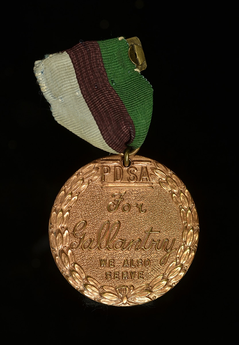 In 1917 Maria Dickin opened the animal shelter and charity, People’s Dispensary for Sick Animals (PDSA). In 1943, she created the PDSA Dickin Medal to recognise gallantry and devotion to duty displayed by animals serving with the Armed Forces or Civil Defence units. Winkie was one of the first animals to be awarded the Dickin Medal. Image courtesy of Dundee Art Galleries and Museums. 1952-2-1.