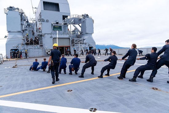 Another ship comes alongside and transfers equipment, food or fuel. The jackstay is a strong wire cable that connects the ship needing the supplies to the ship bringing the supplies.