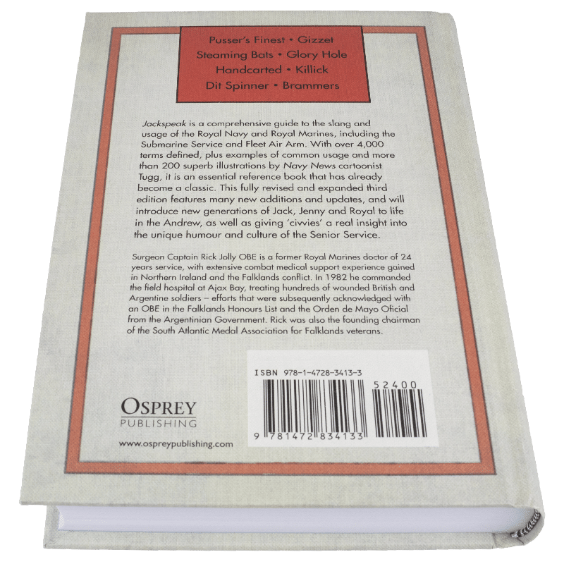 Jackspeak is a comprehensive reference guide, in hardcover, to the humorous and colourful slang of the Senior Service, explaining in layman’s terms the otherwise cryptic everyday language of the Royal Navy, the Royal Marines and the Fleet Air Arm. Featuring more than 4,000 alphabetical entries, it was compiled by an ex-RM surgeon who spent 24 years in the service. With useful cross-references and examples of common usage throughout, along with excellent illustrations by Tugg, the cartoonist from service newspaper Navy News, it is the essential book for current and ex-Navy personnel and their families, or anyone interested in the modern armed forces.
