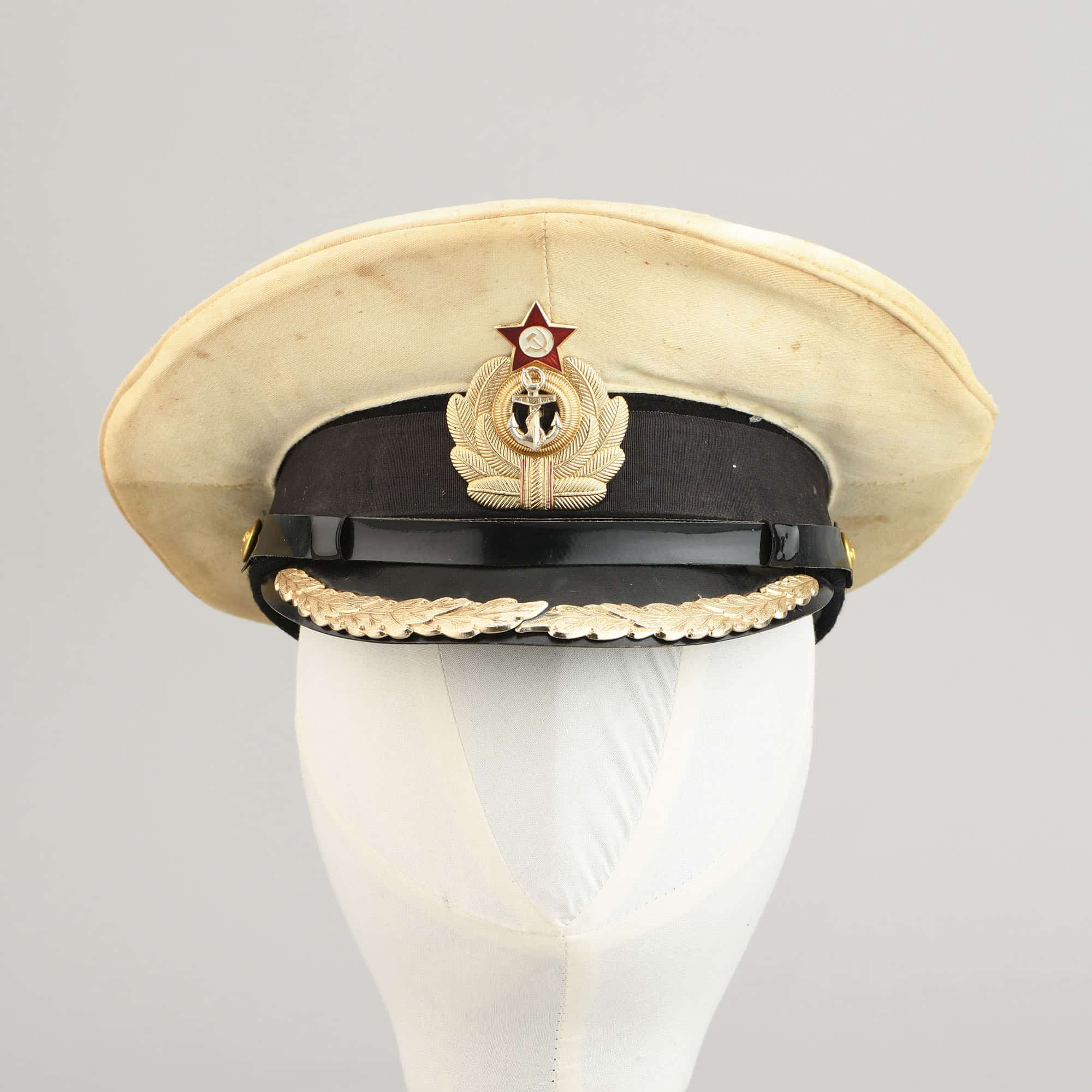 This naval cap was gifted to Lieutenant Commander Denis Glover during an academic visit to the Soviet Union in 1975. A Commander of the Red Fleet presented the cap to Glover along with a Soviet Union veteran’s medal. The medal acknowledged his service during the Second World War escorting Arctic Convoys which protected the supply chain to Russia.