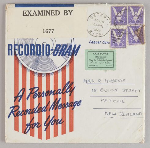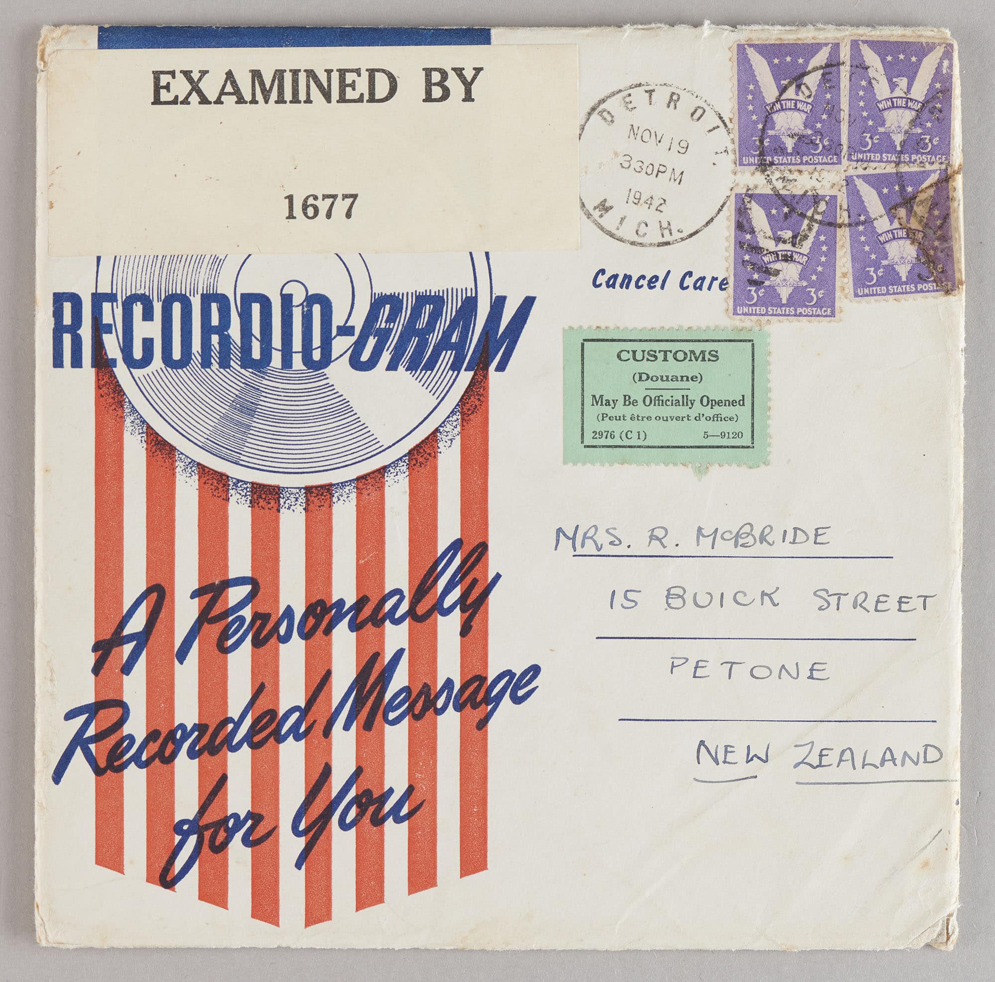Sub Lieutenant (A) Glen McBride used this cardboard record to send self-recorded messages from the USA back to his family in New Zealand. Recordio-Grams became popular in America during the Second World War as they were a novel way to send voice messages to friends and family.