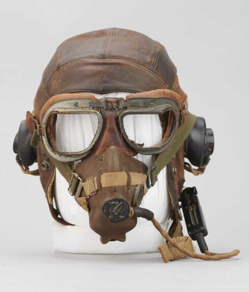 This flight headgear belonged to Lieutenant James McAndrew, who joined the Fleet Air Arm (FAA) in 1940. He was sent to England for initial training and went on to fly catapult aircraft such as the amphibious Supermarine Walrus.