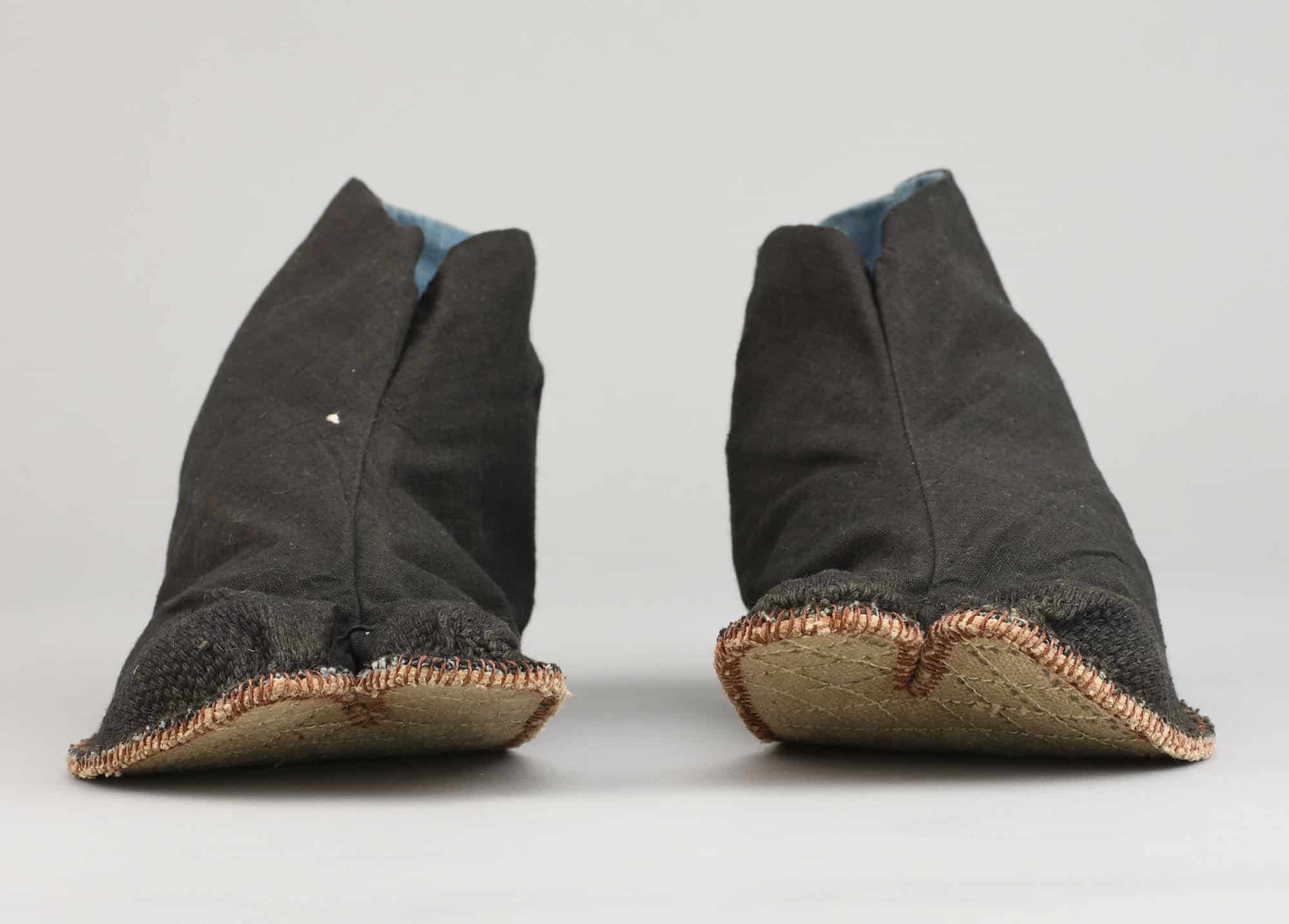 This pair could possibly have been ‘sashiko tabi’, intended for use for matsuri (festivals). The word tabi is commonly understood to mean a sock, which is often worn with geta and zori (types of Japanese sandals). Outdoor tabi, often made from cloth, leather, or straw, have been worn in Japan for centuries. As the exact provenance is unknown, the pair in our collection could be tabi which were intended for inside use, or to be worn outdoors with or without sandals.