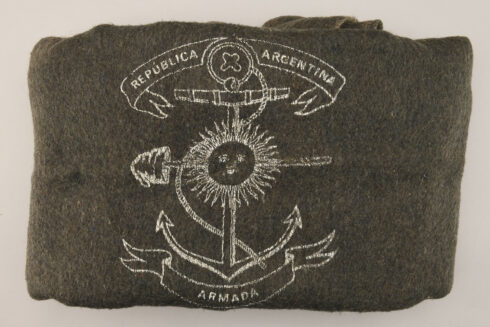 Blanket printed with the crest of the Armada de la Repύblica Argentina (Argentinian Navy). Taken as a souvenir by Lieutenant Commander John Murray in 1983 when he served in the Falkland Islands with the Royal Navy (he later served in the Royal New Zealand Navy).