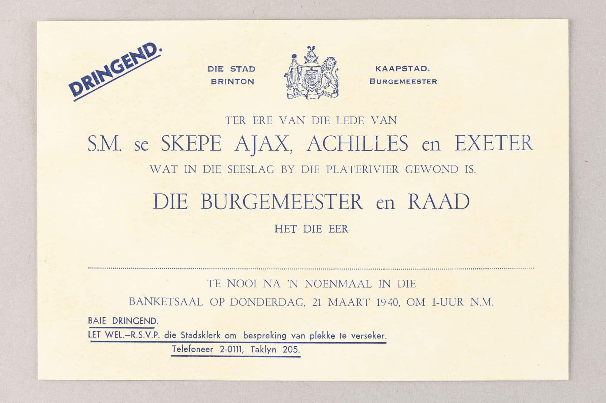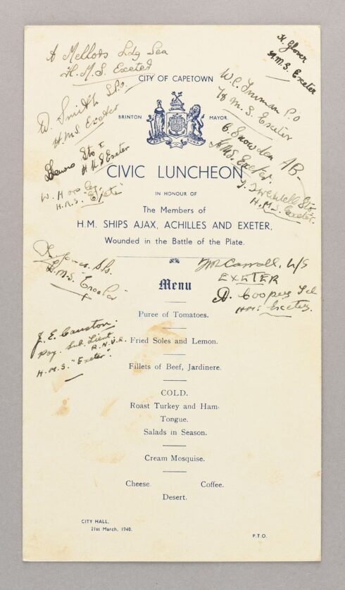 The invitation for the event is written in Afrikaans on one side and English on the other, and the menu has been signed by members of the ship’s company of HMS Exeter.