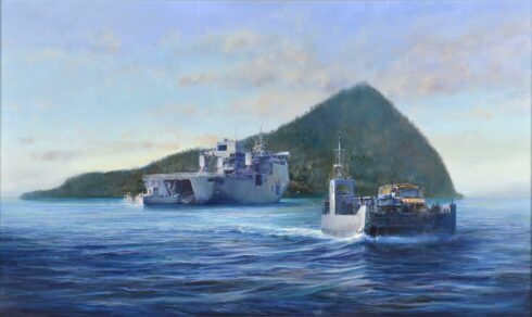 This painting shows HMNZS Canterbury (L421) and her landing craft, which supported Vanuatu after Tropical Cyclone Pam in April 2015. The storm is regarded as the worst natural disaster in the history of Vanuatu, decimating homes and infrastructure across Vanuatu’s many islands. Canterbury supported the recovery effort as part of Operation Pacific Relief. She carried personnel, heavy engineering equipment and 150 tonnes of food and other supplies.