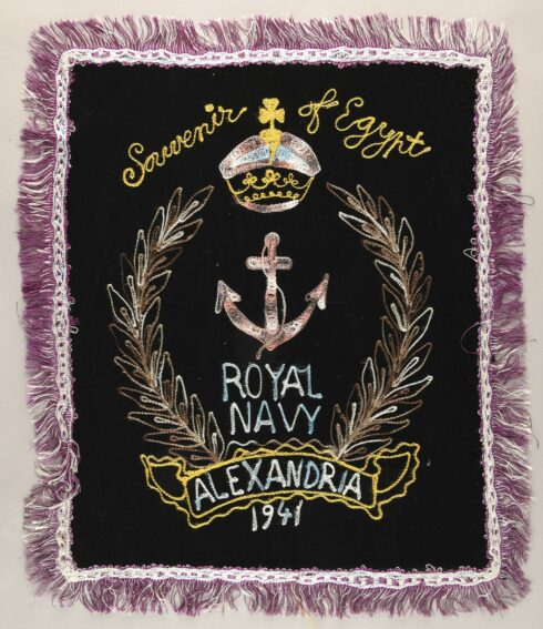 One of two embroidered cushion covers purchased in Egypt in 1941 by Able Seaman Jack True, likely sent as gifts to his family in New Zealand. At this time True was posted to HMS Neptune, which had arrived in Alexandria earlier that year to bolster the 7th Cruiser Squadron in the Mediterranean.