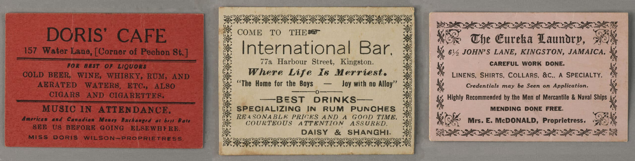 Collected in Jamaica by sailors from HMS Achilles in January 1939. Achilles docked in Kingston after passing through the Panama Canal to refuel before making the Atlantic crossing to England. The cards show some of the services sailors used while ashore.